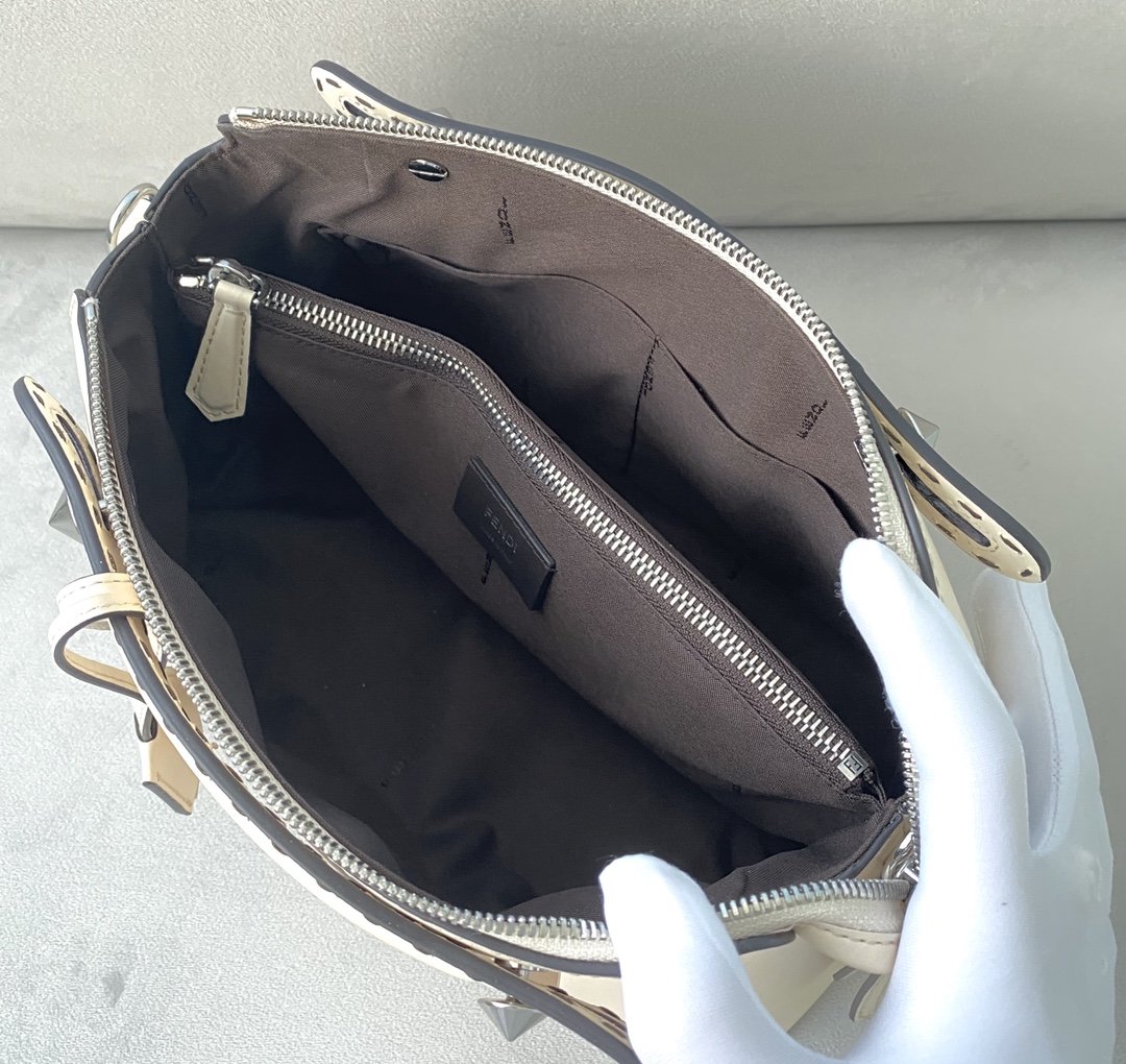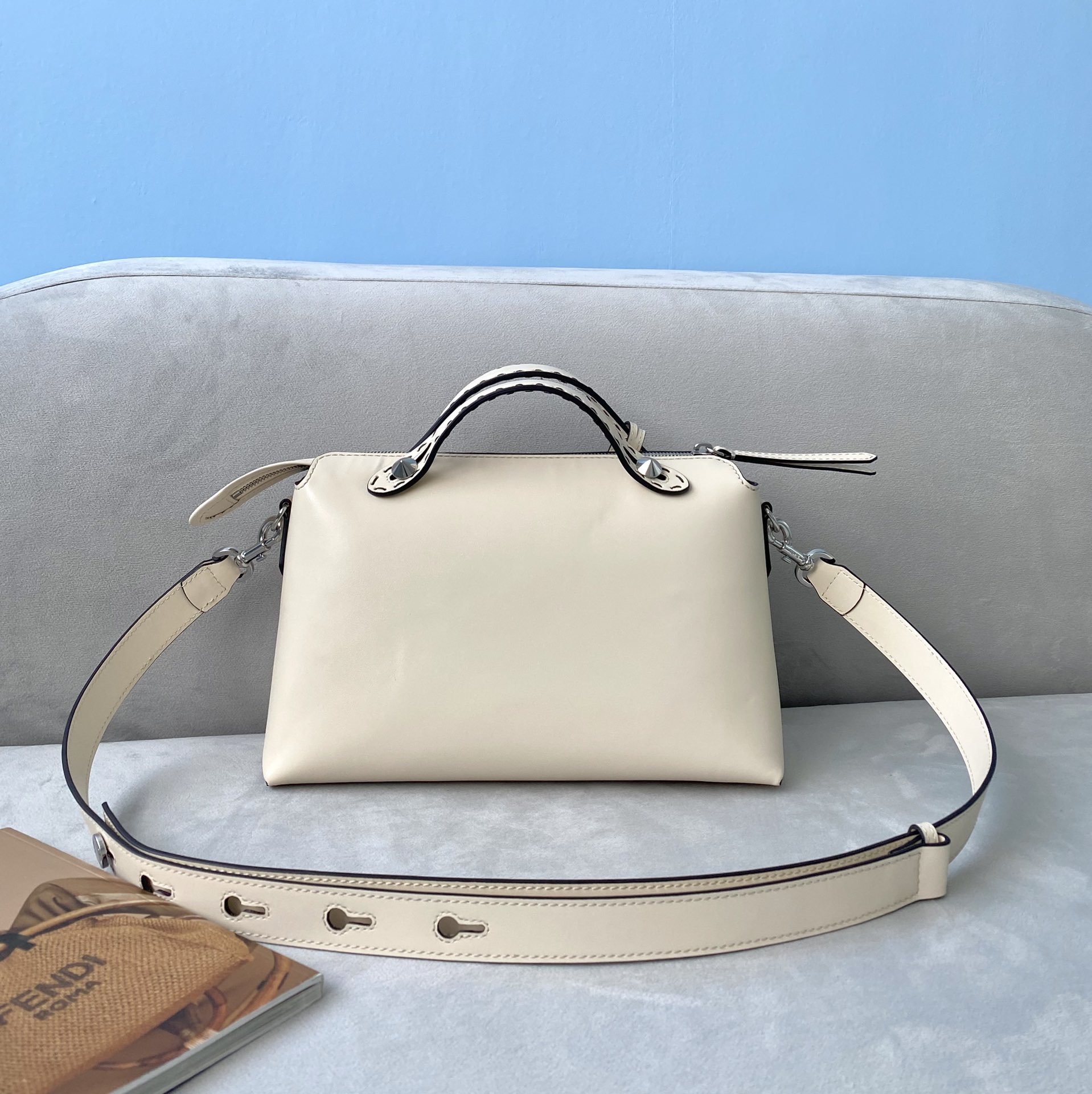 Medium Iconic By The Way Boston bag, made of white with hot-stamped “FENDI ROMA” and zip fastening. The bag can be carried by hand with the handles, or worn either on the shoulder or cross-body with the adjustable, detachable shoulder strap. Customisable pendant.