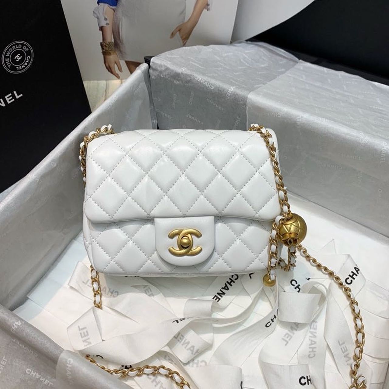 Chanel Mini Flap Bag With Chanel Ball On Strap White For Women, Women’s Handbags, Shoulder And Crossbody Bags 6.7in/17cm AS1786