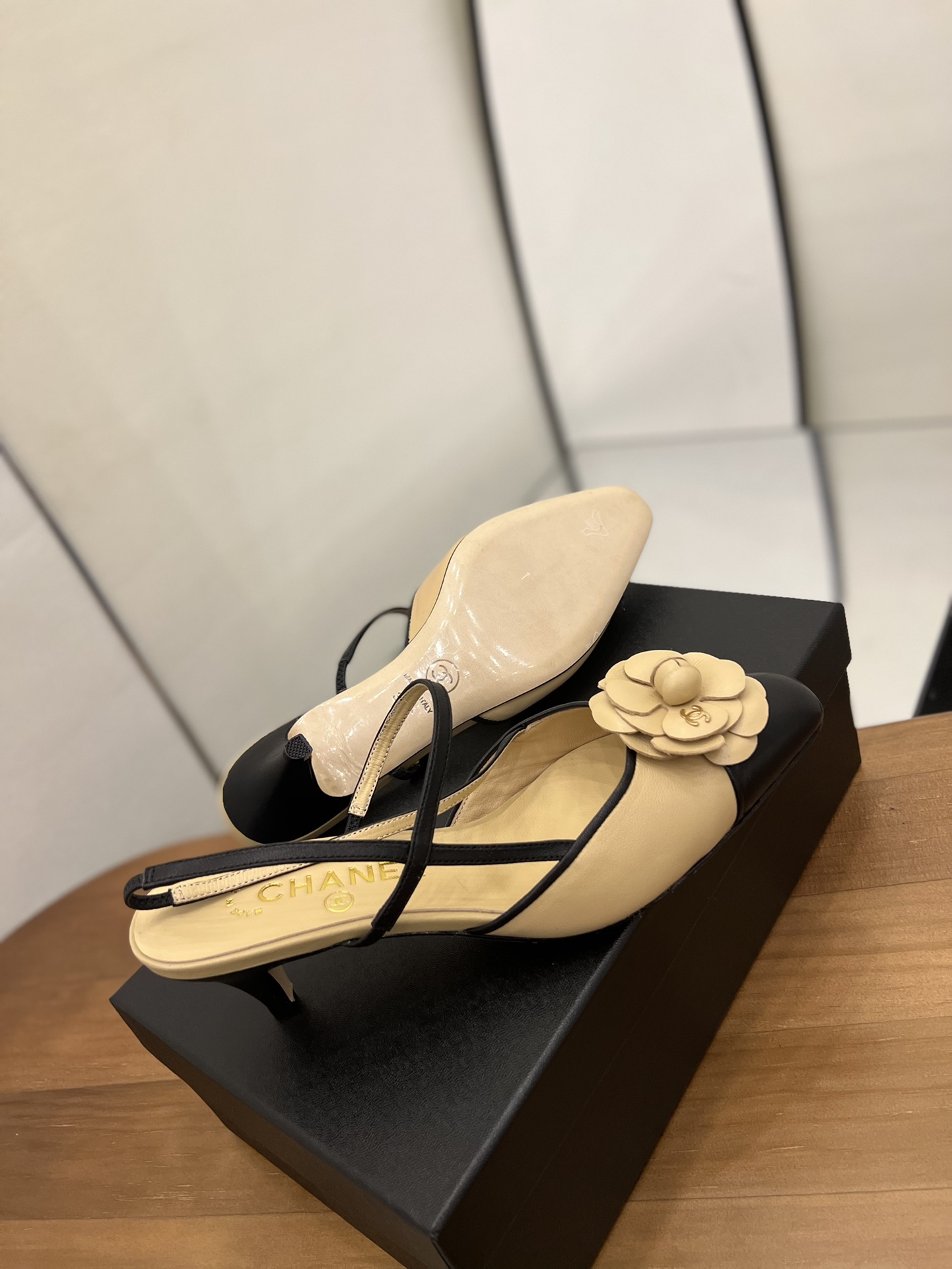 This gorgeous pair of Chanel heels features a cap toe and thin slingback strap and strap across the front of the foot. There is a large Camellia at front, with a small gold Chanel on the side. Has an elasticized sling back and a covered heel.