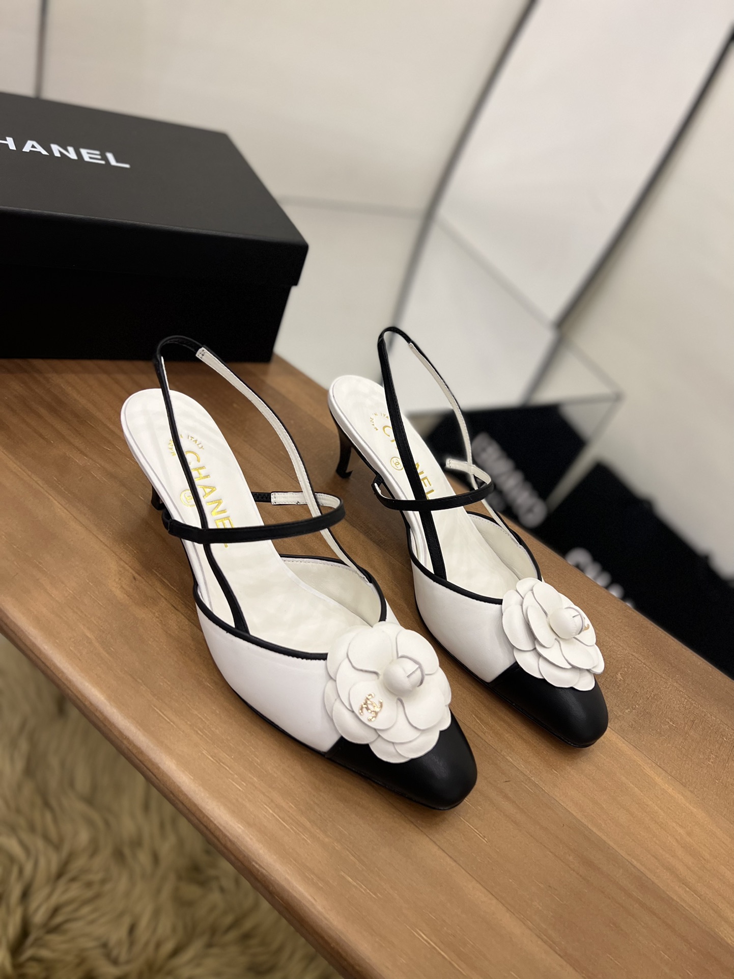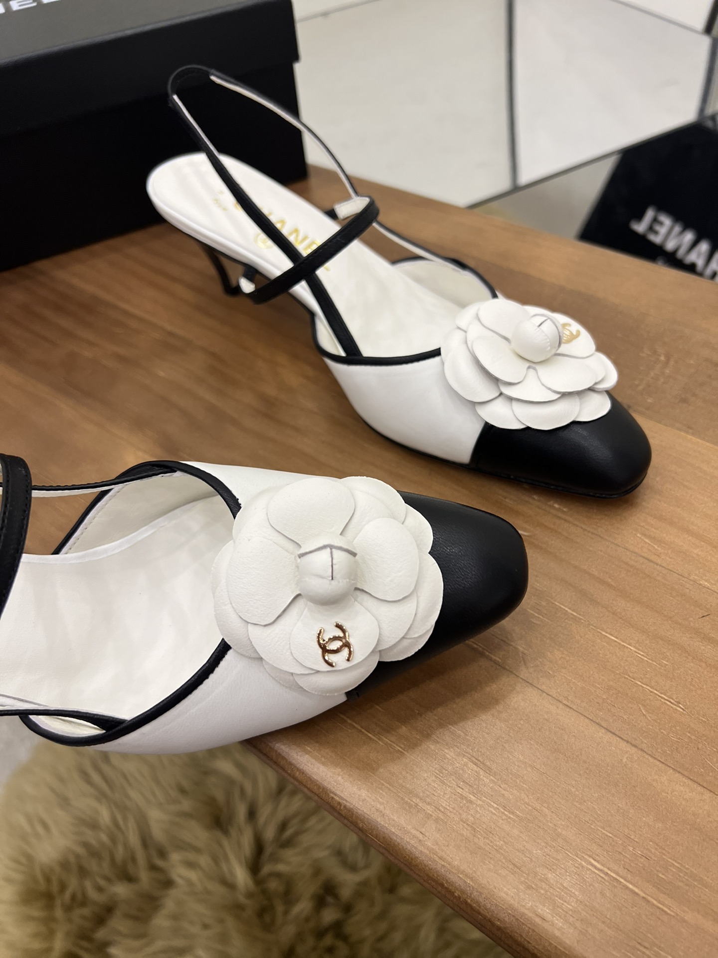 This gorgeous pair of Chanel heels features a cap toe and thin slingback strap and strap across the front of the foot. There is a large Camellia at front, with a small gold Chanel on the side. Has an elasticized sling back and a covered heel.