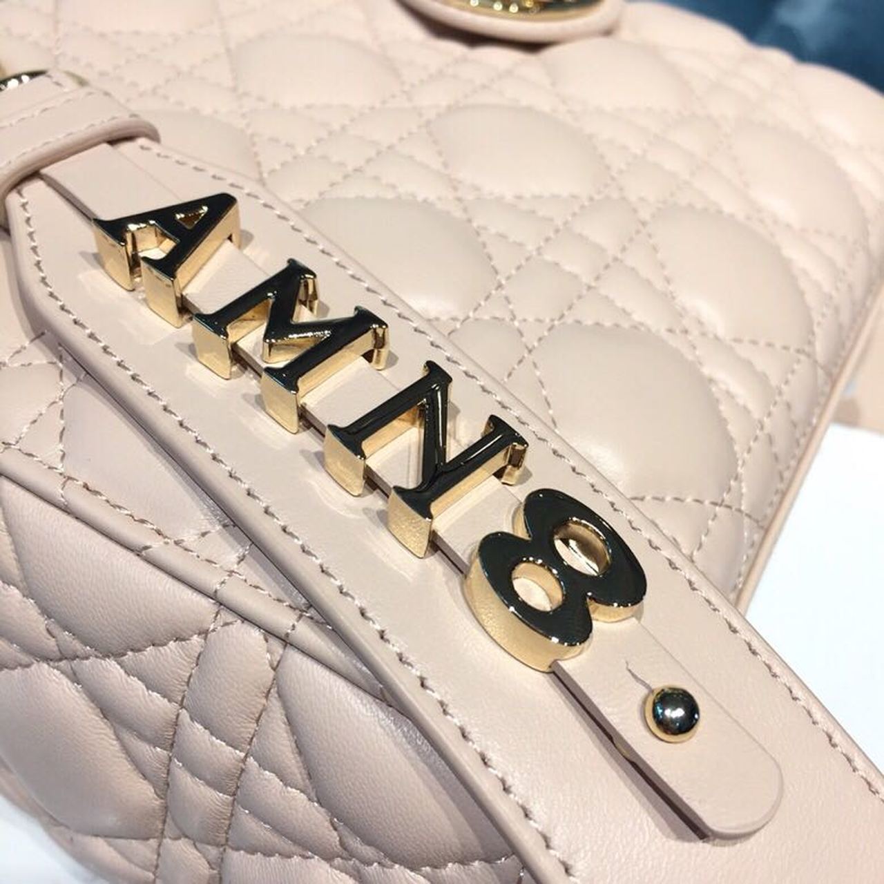 The Lady Dior My ABCDior bag epitomizes DYOR’s vision of elegance and beauty. Sleek and refined, the timeless style is crafted in latte lambskin with Cannage stitching, creating the instantly recognizable quilted texture. Pale gold-finish metal ‘D.I.O.R.’ charms further embellish its silhouette with an elegant allure. Featuring a shoulder strap that can be personalized with badges, the small, unique design may be carried by hand or worn crossbody.