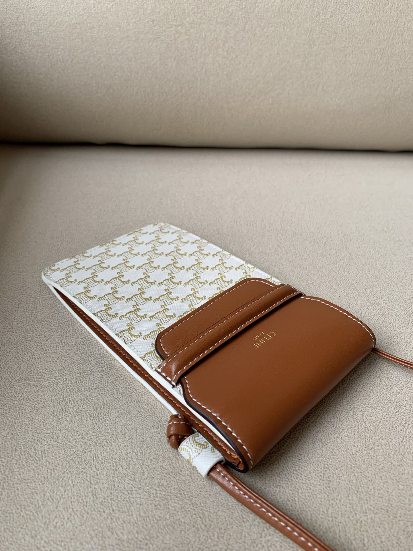 Celine Phone Pouch With Flap In Triomphe Canvas And Lambskin White/Tan For Women 7in/18cm 10G332CQD.01TA