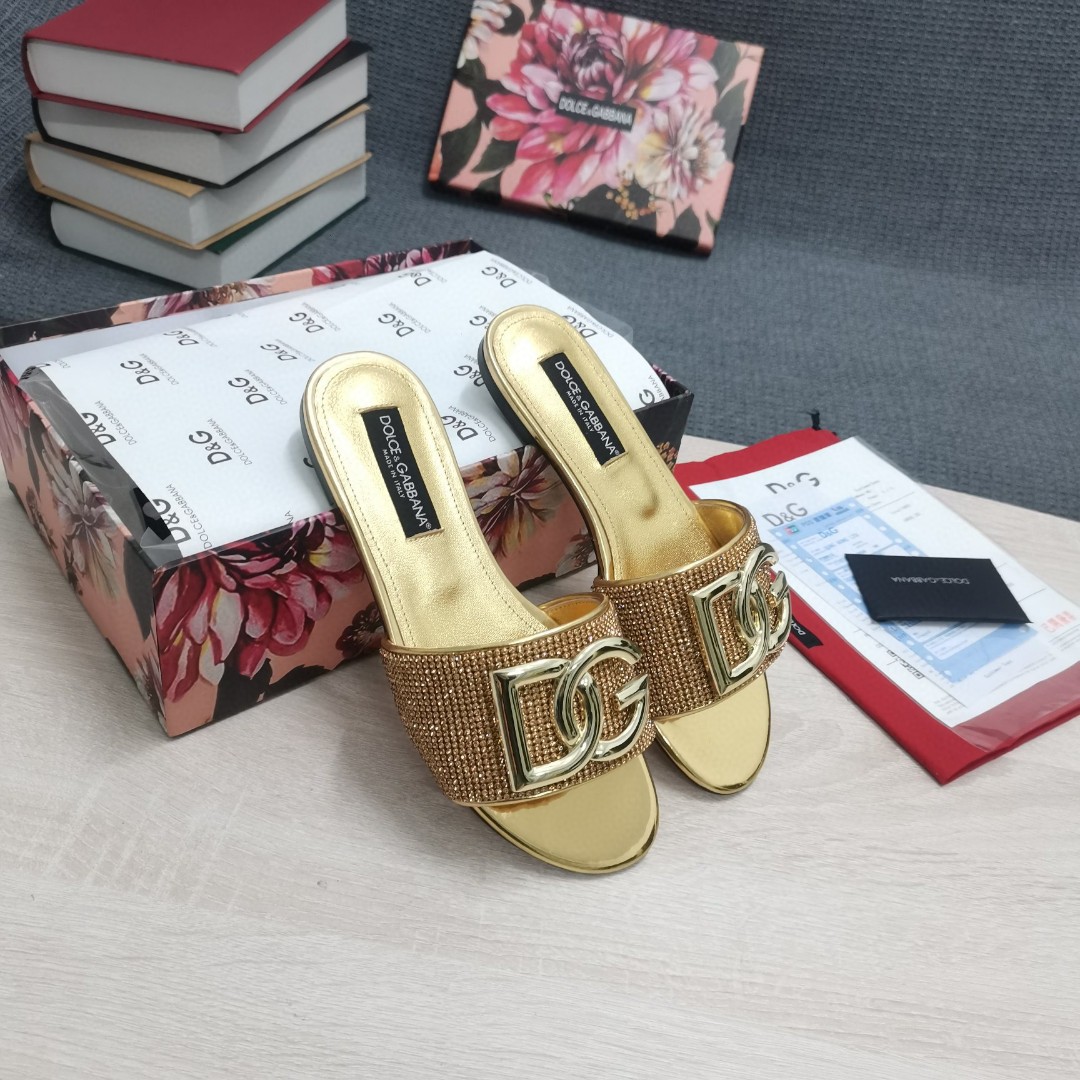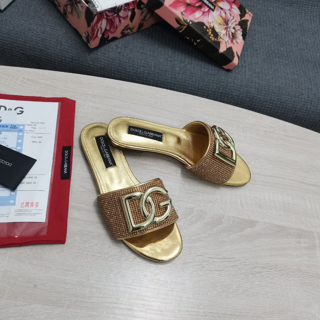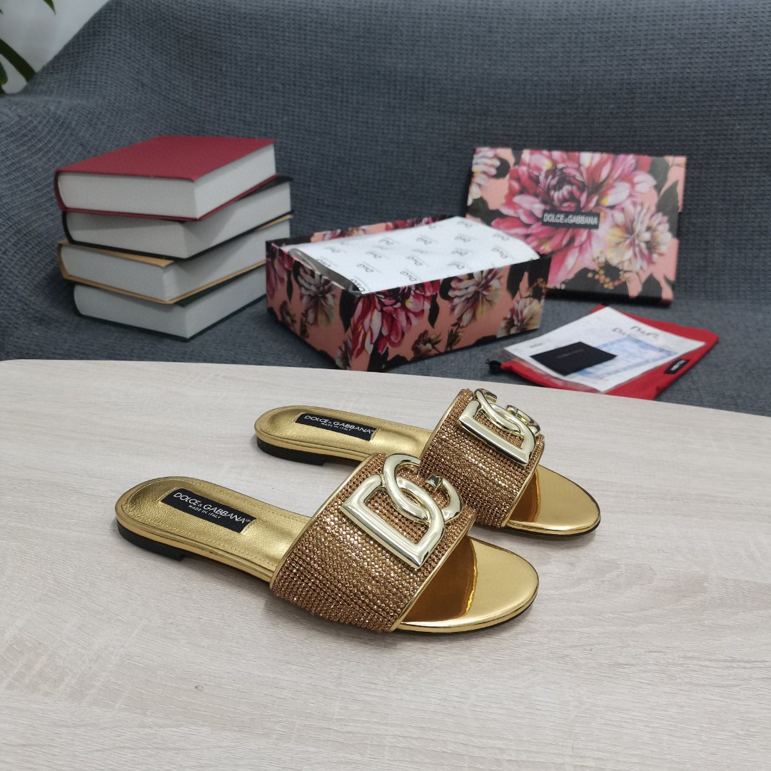 • Dolce & Gabbana Crystal Mesh Sliders With DG Logo Gold For Women DG Shoes