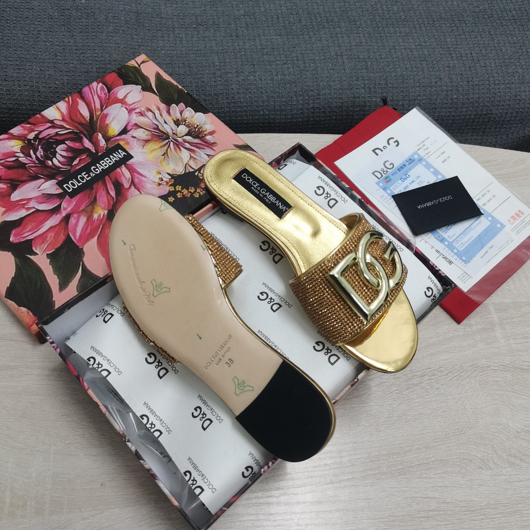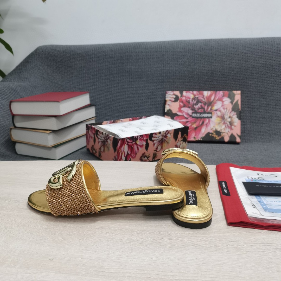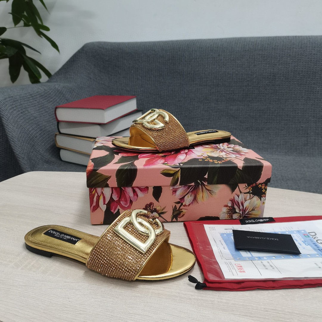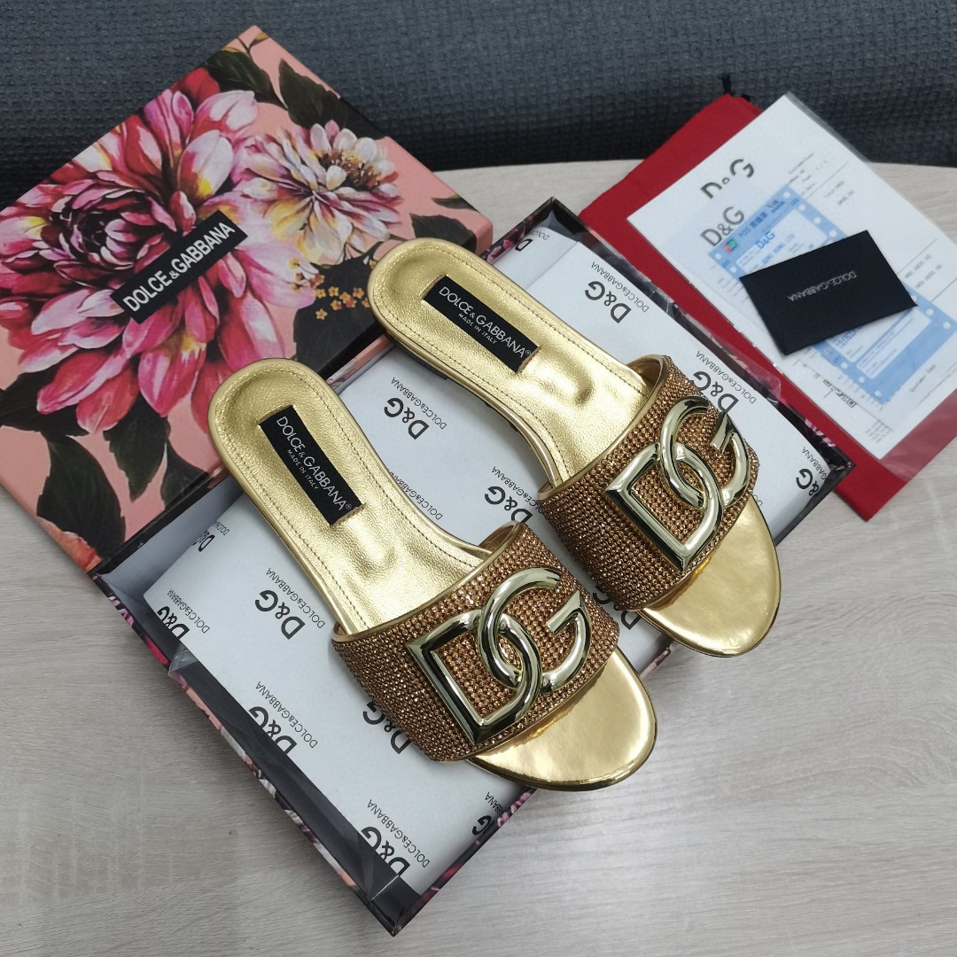 • Dolce & Gabbana Crystal Mesh Sliders With DG Logo Gold For Women DG Shoes