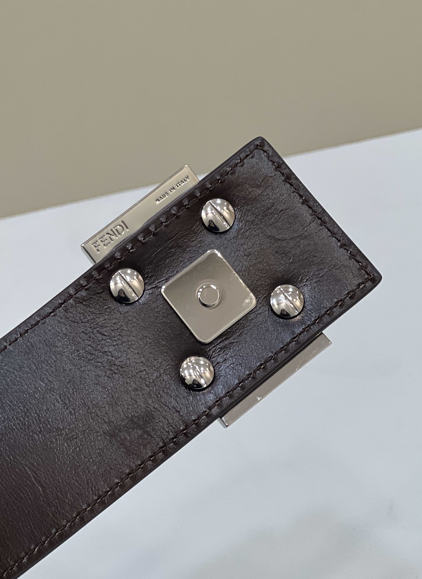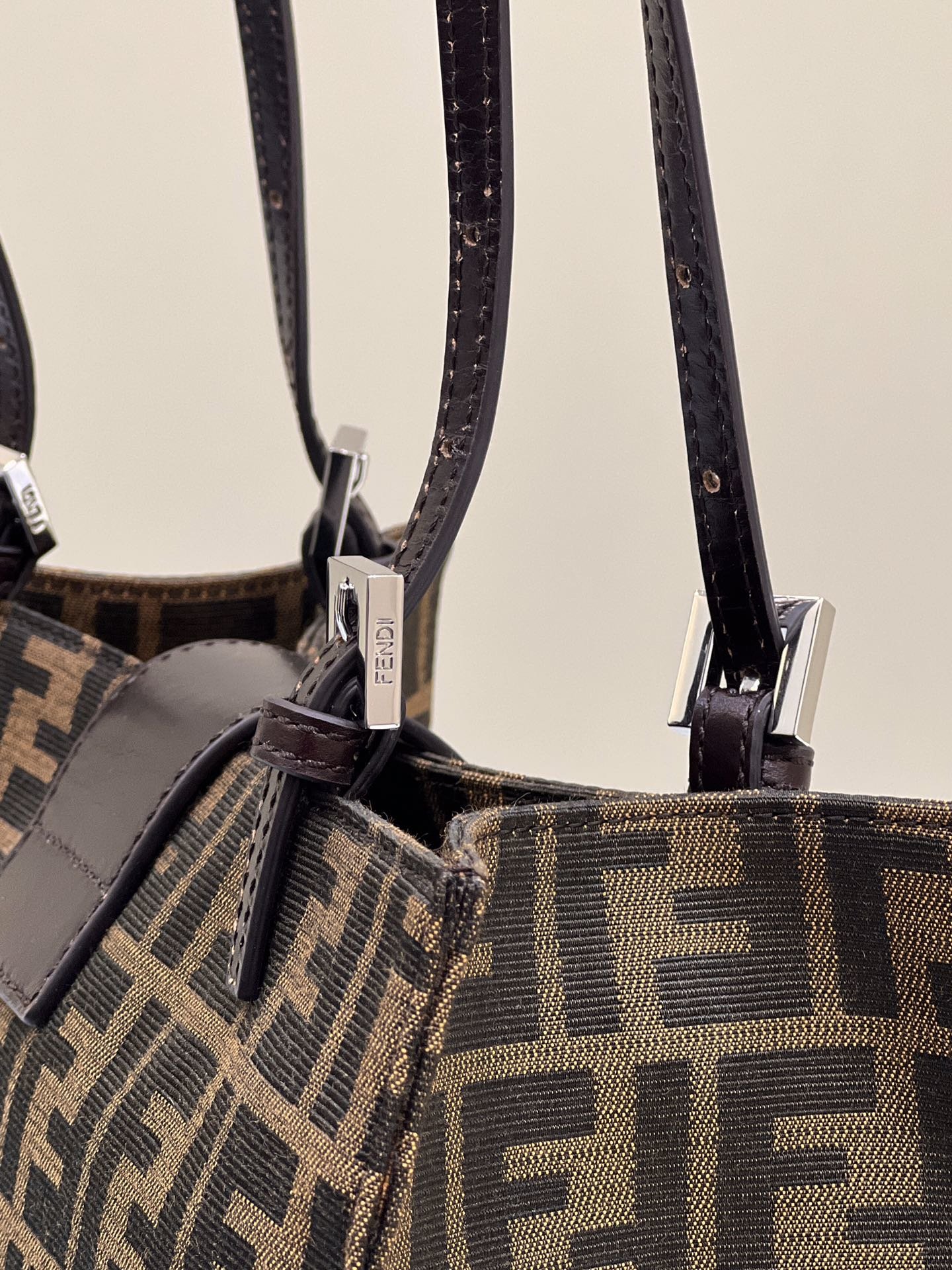 Vertical design shopping bag made of light grey Cuoio Romano leather with tone on tone varnished FF Baguette buckle.
