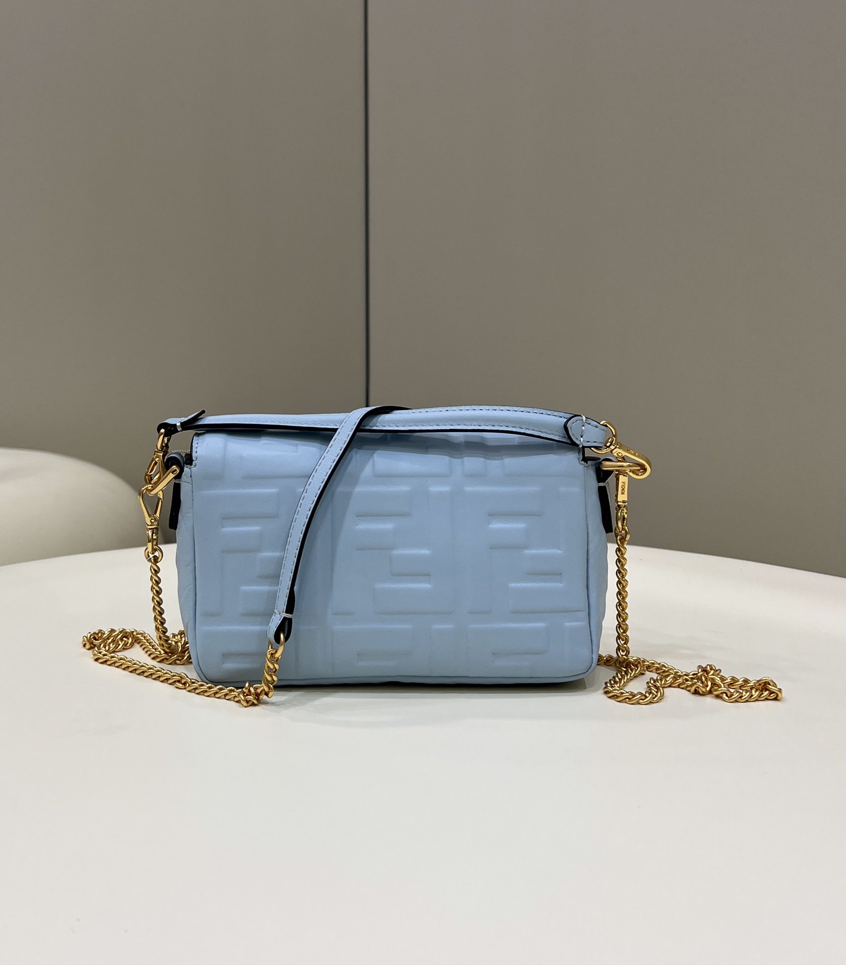 Iconic mini Baguette bag, made of soft blue-coloured nappa with an embossed FF motif and decorated with an FF clasp. The bag can be carried by hand, or worn either on the shoulder or cross-body thanks to the handle and shoulder strap, both detachable.