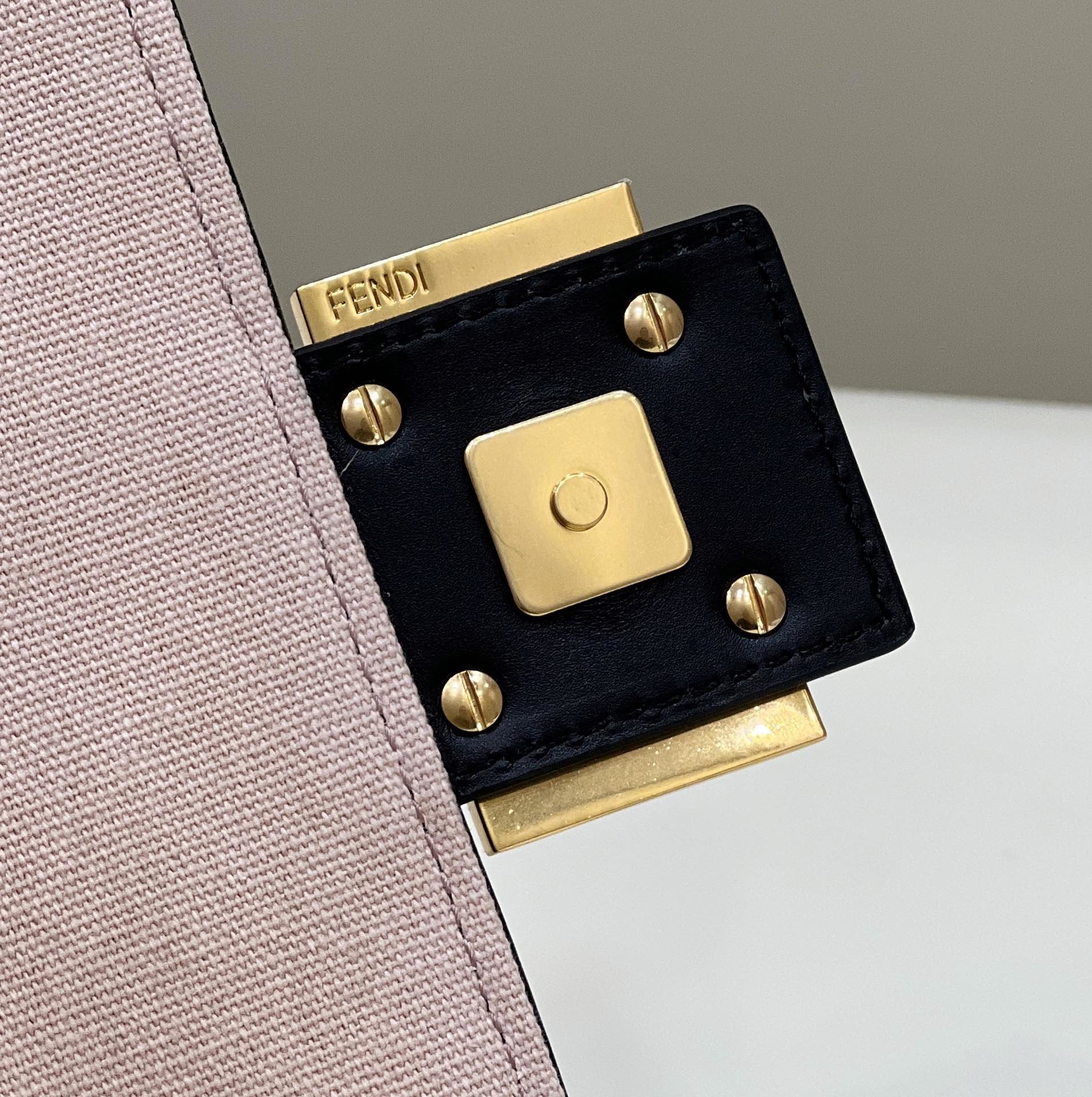 Iconic medium Baguette bag made of light pink canvas with a tone on tone embossed embroidered FF motif created trimmed in grey and embellished with an FF clasp. The bag can be carried by hand, or worn either on the shoulder or cross-body thanks to the handle and Pequin canvas shoulder strap, both detachable.