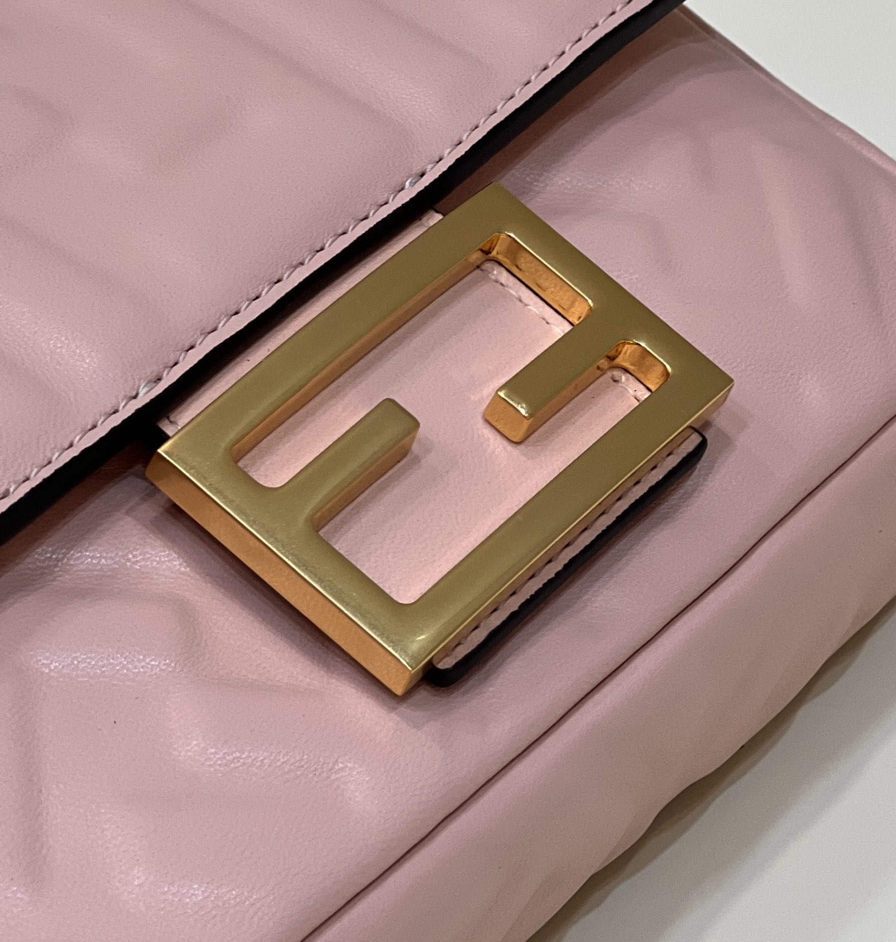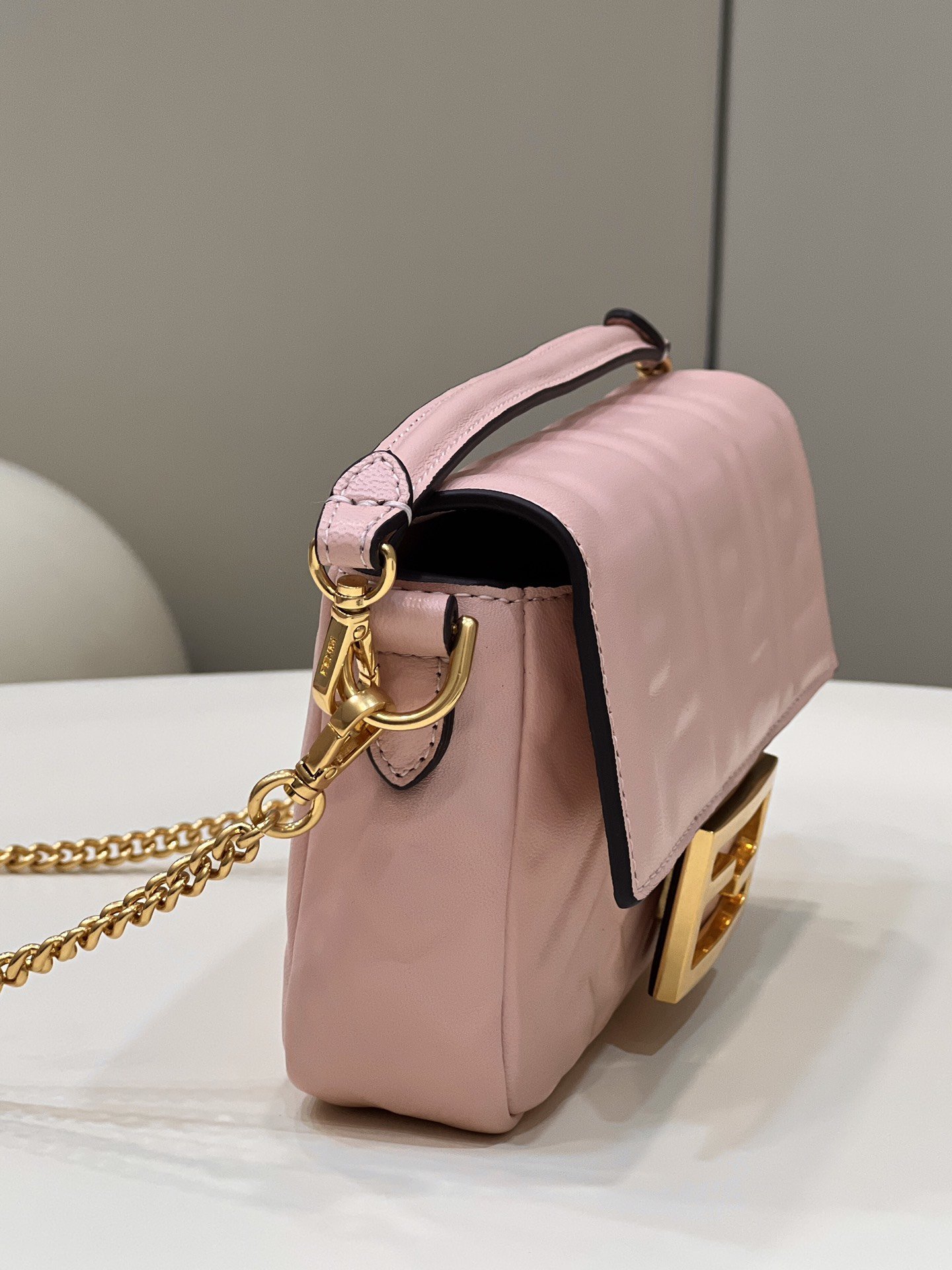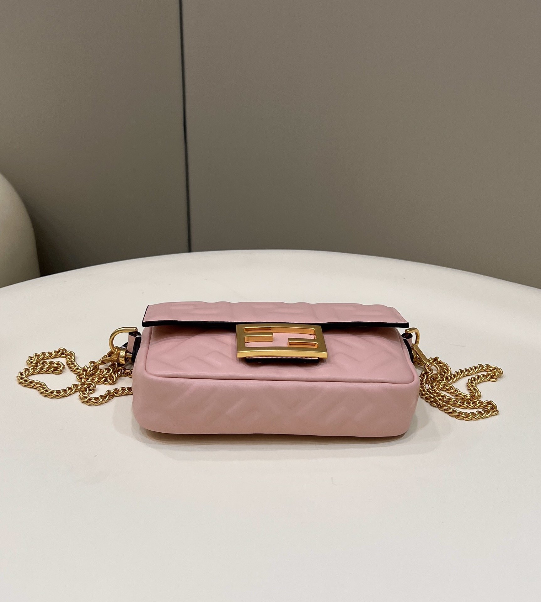 Iconic mini Baguette bag, made of soft pink-coloured nappa with an embossed FF motif and decorated with an FF clasp. The bag can be carried by hand, or worn either on the shoulder or cross-body thanks to the handle and shoulder strap, both detachable.
