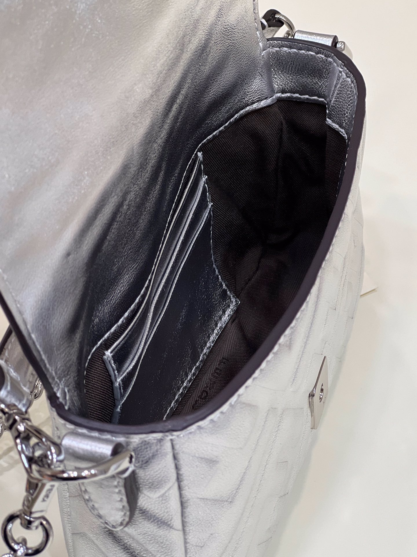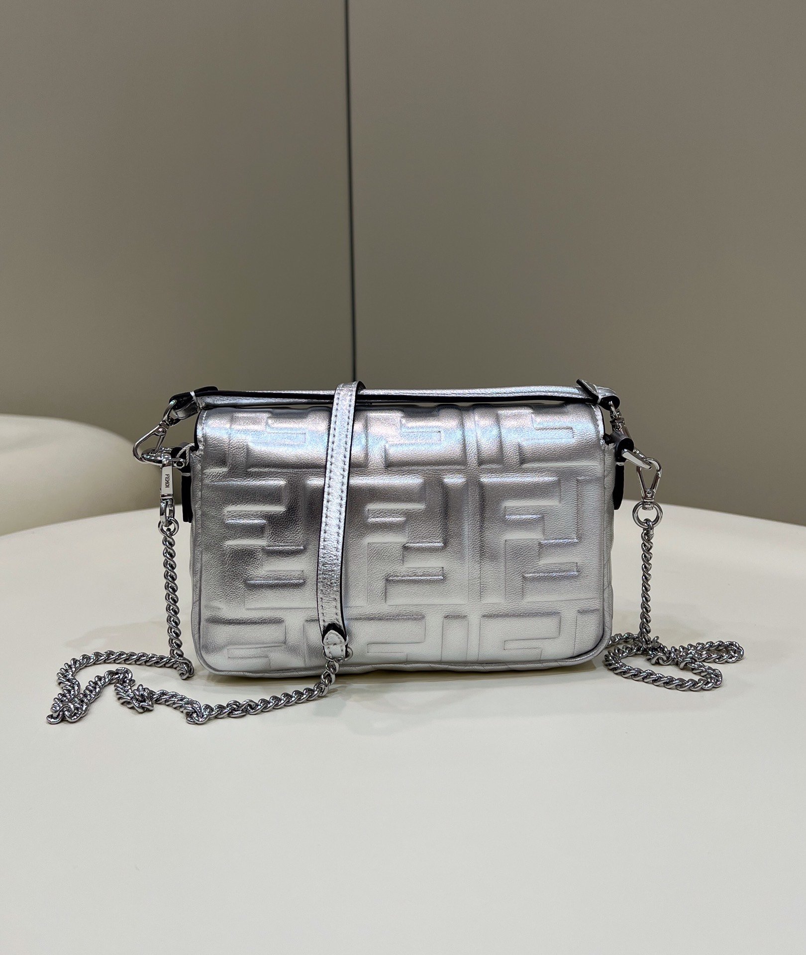 Iconic mini Baguette bag, made of soft silver-coloured nappa with an embossed FF motif and decorated with an FF clasp. The bag can be carried by hand, or worn either on the shoulder or cross-body thanks to the handle and shoulder strap, both detachable.