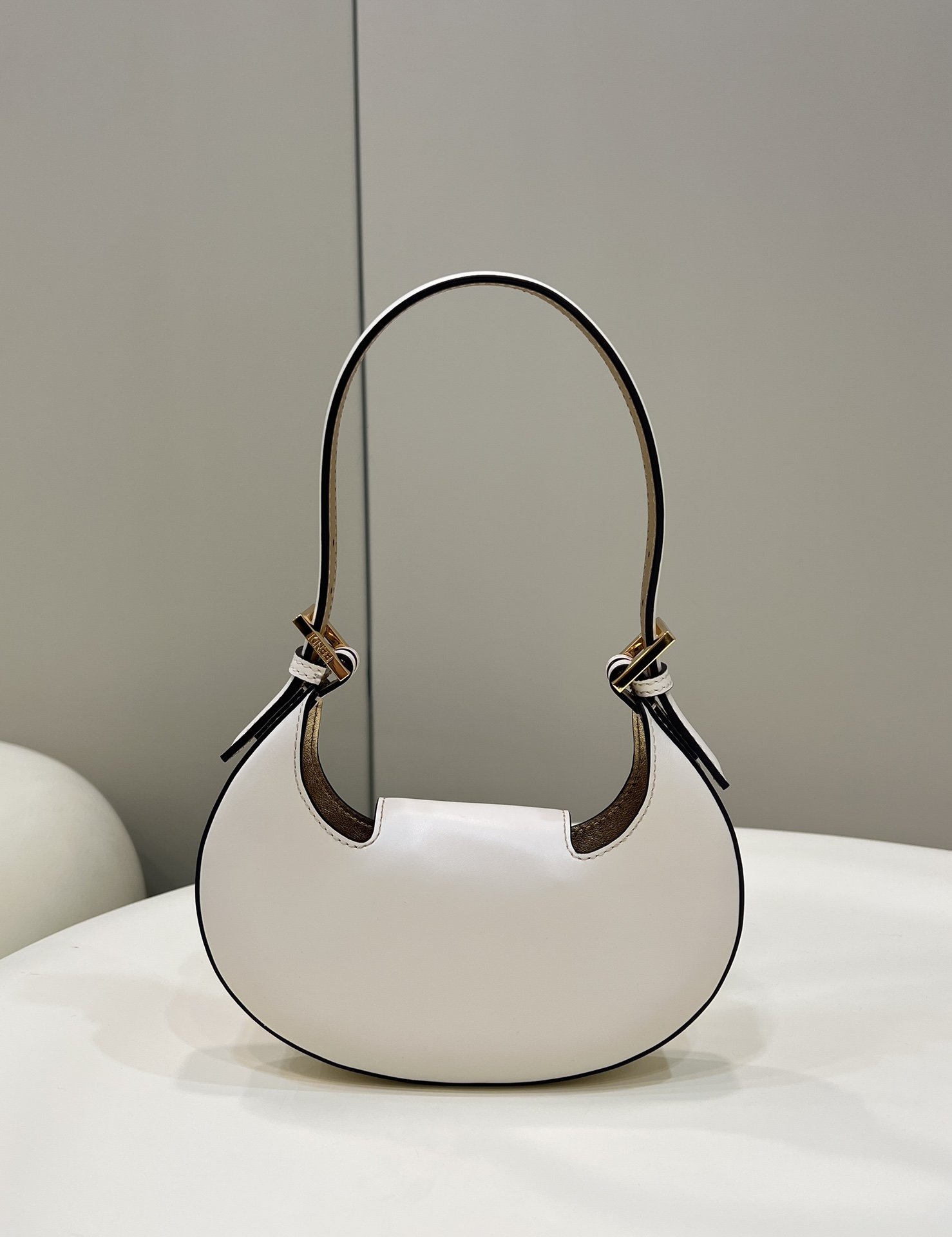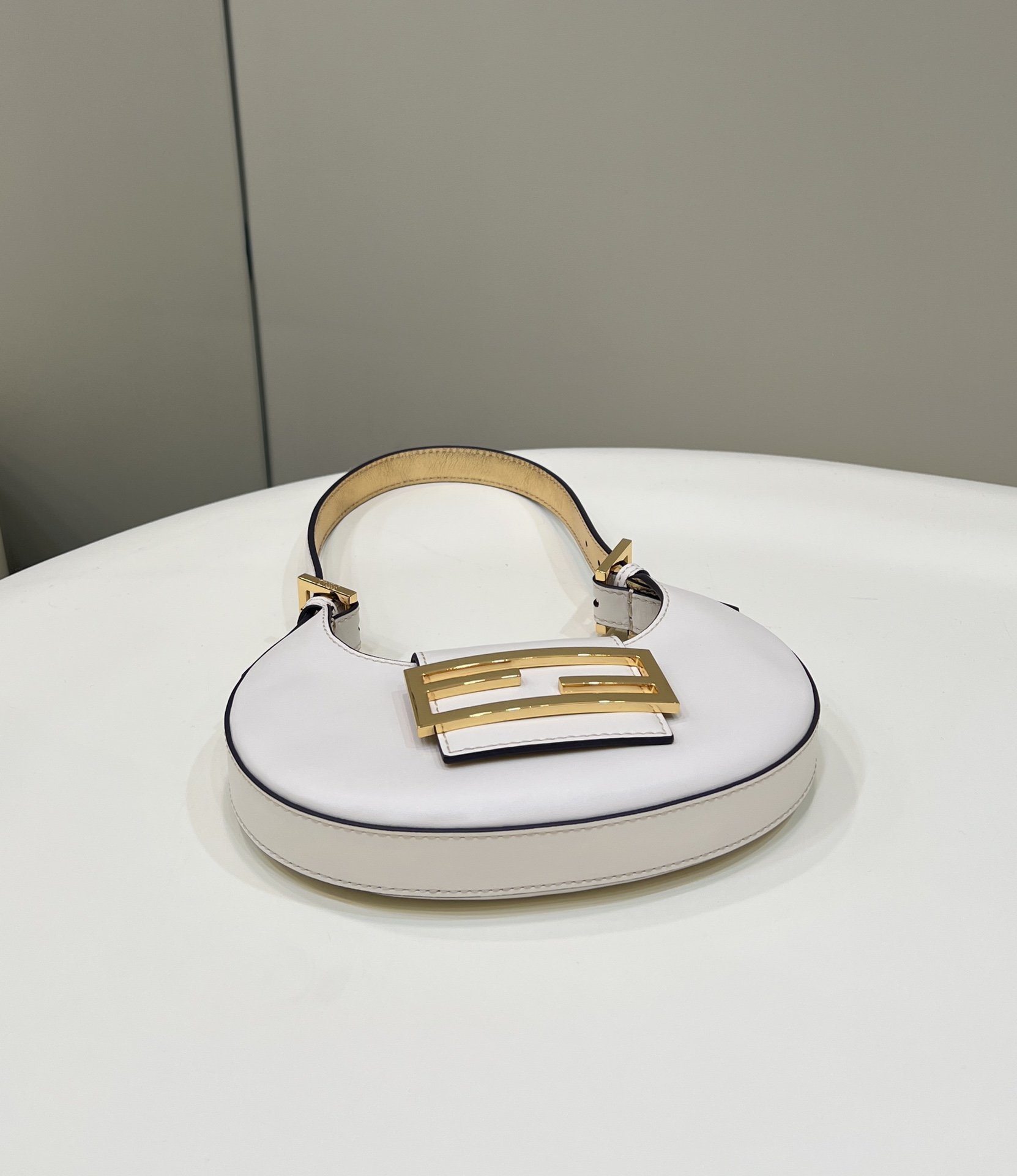Fendi Cookie mini hobo bag made of pale white decorated with an FF clasp. The bag can be carried by hand thanks to the adjustable strap.