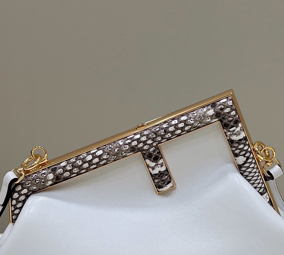 Small Fendi First bag made of soft, white nappa with oversized metal F clasp wrapped in tone on tone python. Can be carried by hand as a clutch or worn on the shoulder thanks to the detachable shoulder strap.