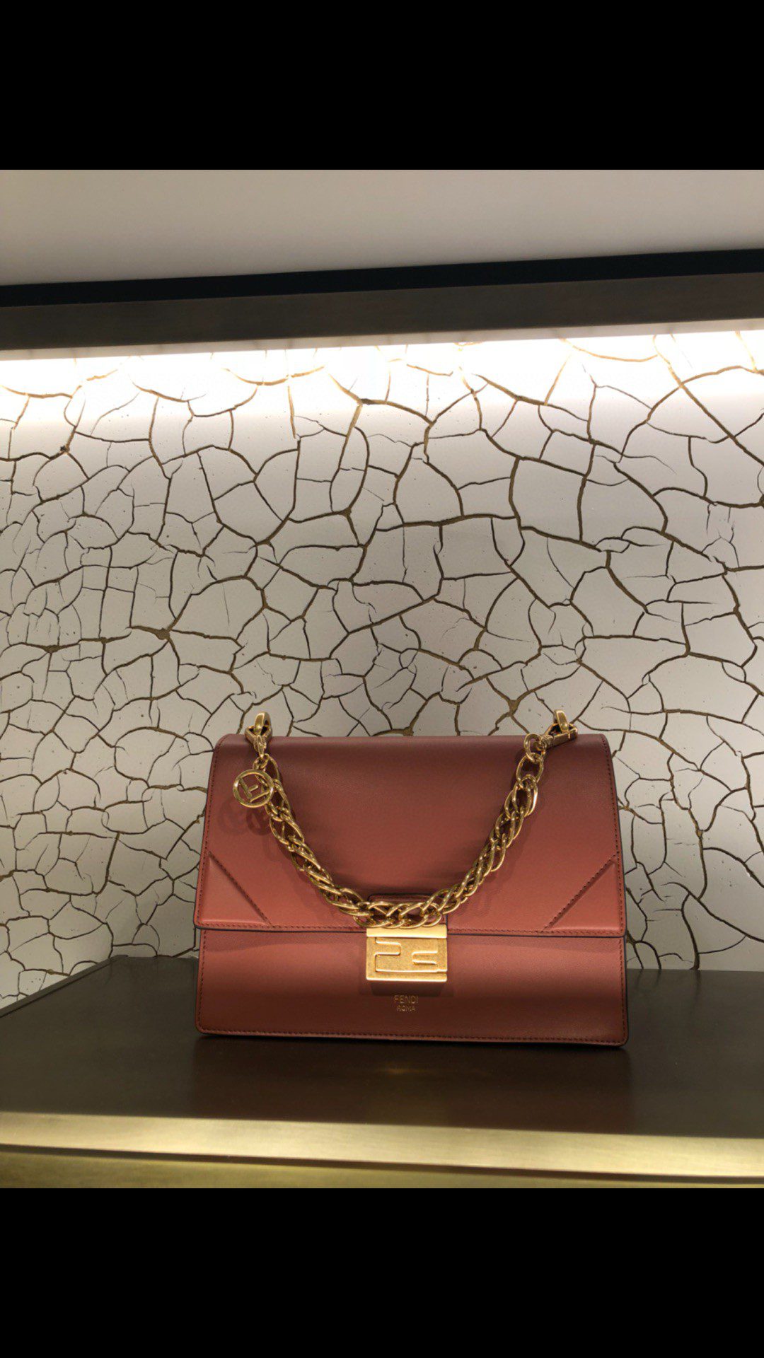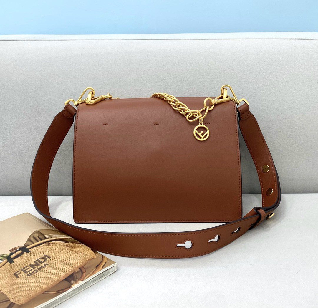 From signature pyramid stud embellishments to the famous double-F logo, this new season you will be presented with a collection that is filled with elegance, flair and confidence. Crafted in brown lamb skin, this small Kan U shoulder bag is a classic. Featuring a foldover top with push-lock closure, a gold-tone logo plaque, an internal slip pocket and a gold-tone chain shoulder strap.