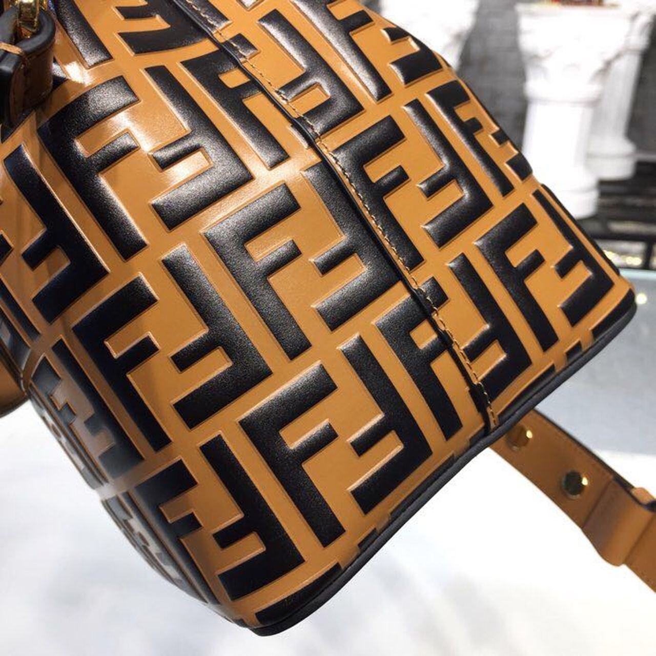 Mon Tresor bucket bag made of embossed and hand-painted with the FF motif in black and brown. Drawstring fastening in brown and details in the Fendi logo shape. Featuring a lined internal compartment, an inner pocket. It can be carried worn either on the shoulder or cross-body thanks to the adjustable and detachable shoulder strap with buttons.