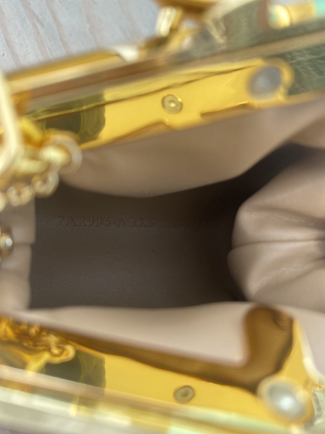 Fendi First Nano bag, with diagonal FF clasp and clip at the back that allows it to be attached to larger bags or belts like a charm. It can also be worn cross-body thanks to the fine chain adjustable shoulder strap. It is the perfect shape to hold AirPods or AirPods Pro wireless earbuds. Made of light brown. Gold-finish metalware.