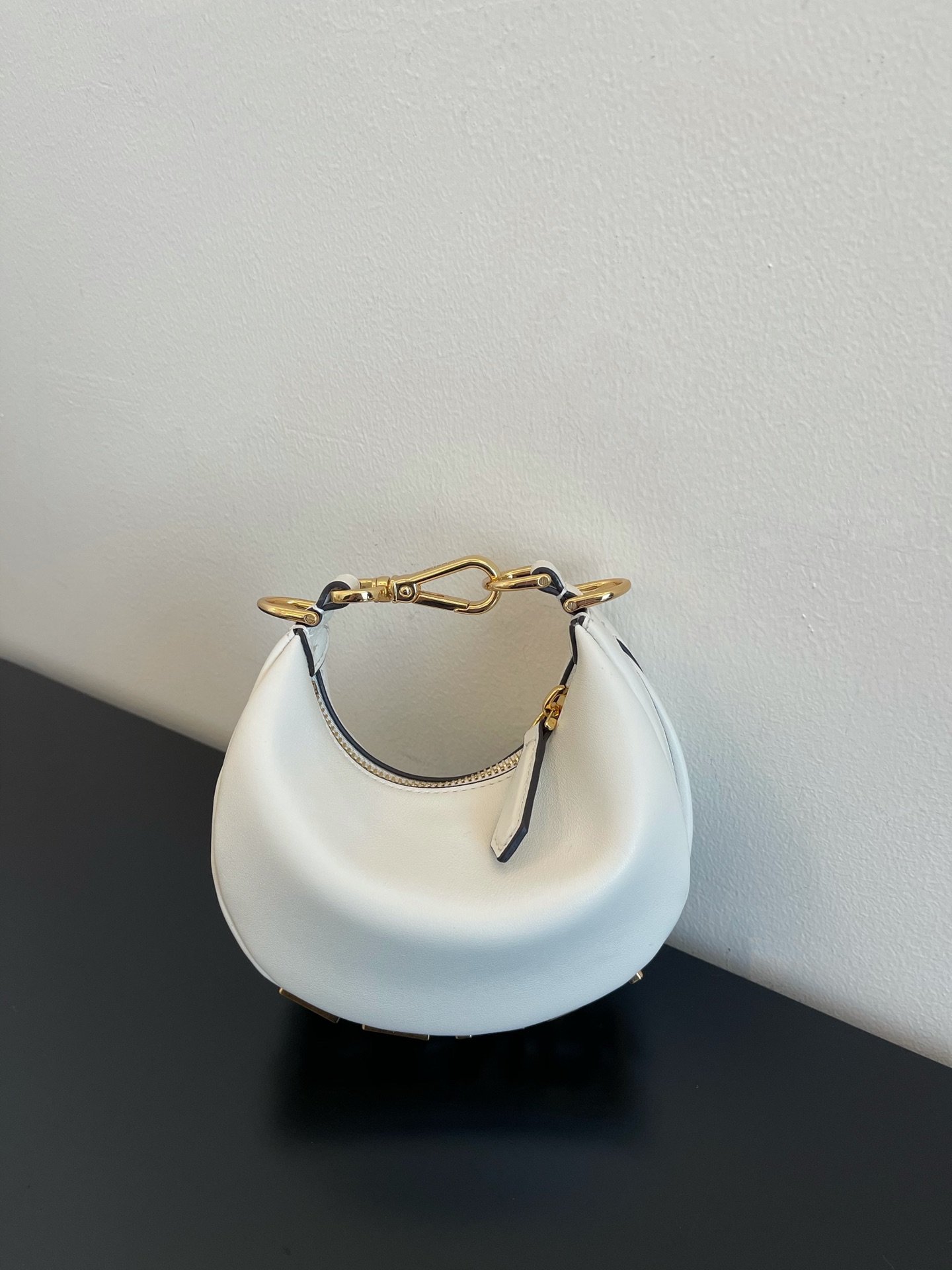 Small hobo bag made of soft white leather, with vintage gold metal Fendi lettering visible when the bag is worn under the arm.