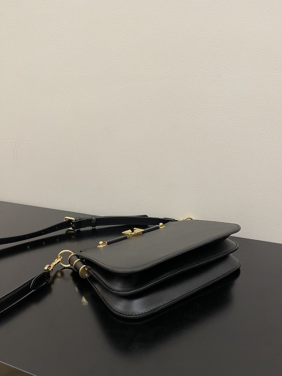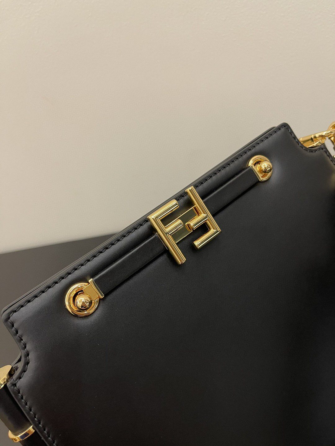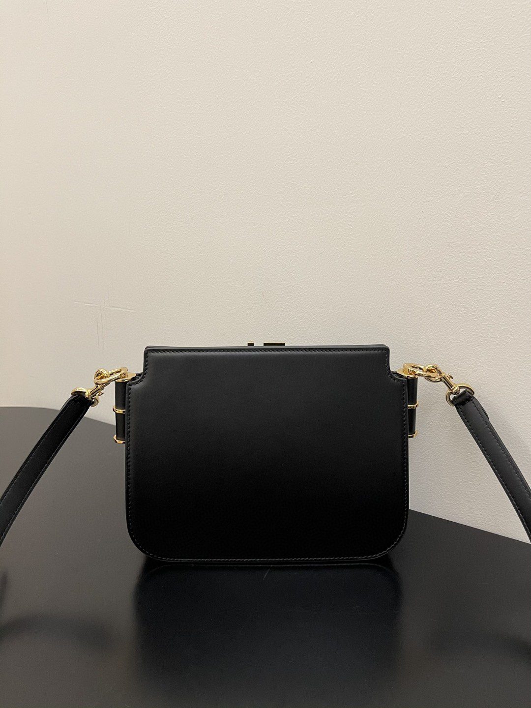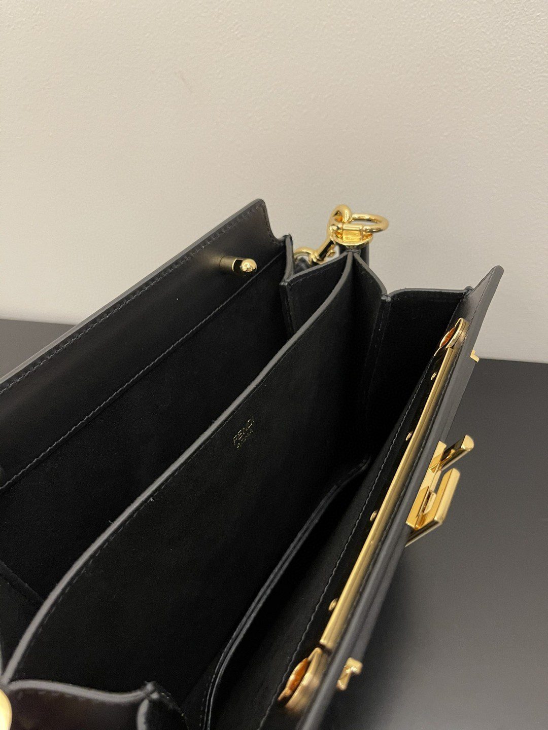 Features two internal compartments, Black leather details and gold-finish metalware.