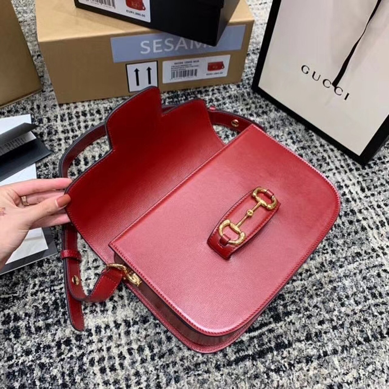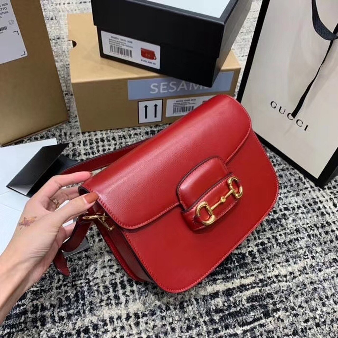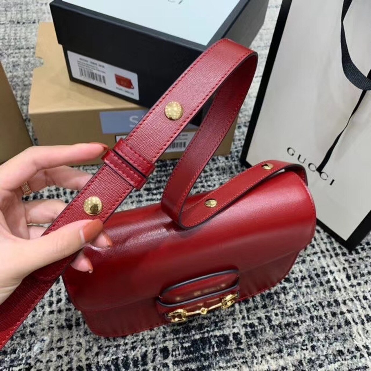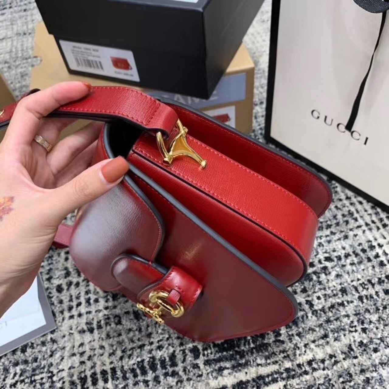 Introduced for Cruise 2020, the Gucci Horsebit 1955 bag is recreated from an archival design. With the same lines and forms first introduced over six decades ago, the accessory unifies the original details with a modern spirit, highlighting the Horsebit. Part of GG’s genetic code, the double ring and bar design has been established as one of the most distinctive elements among the House symbols borrowed from the equestrian world. Presented on a small flap shoulder bag, the hardware is paired with textured red and completed with a special mechanism that adjusts the length of the shoulder strap so it can be carried on one shoulder or cross body.