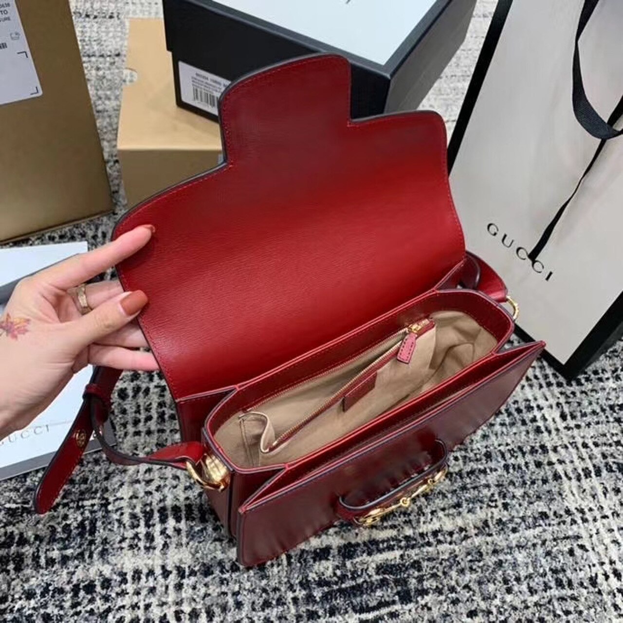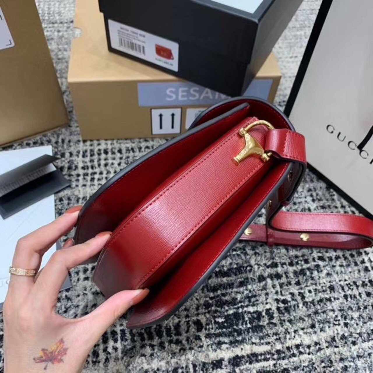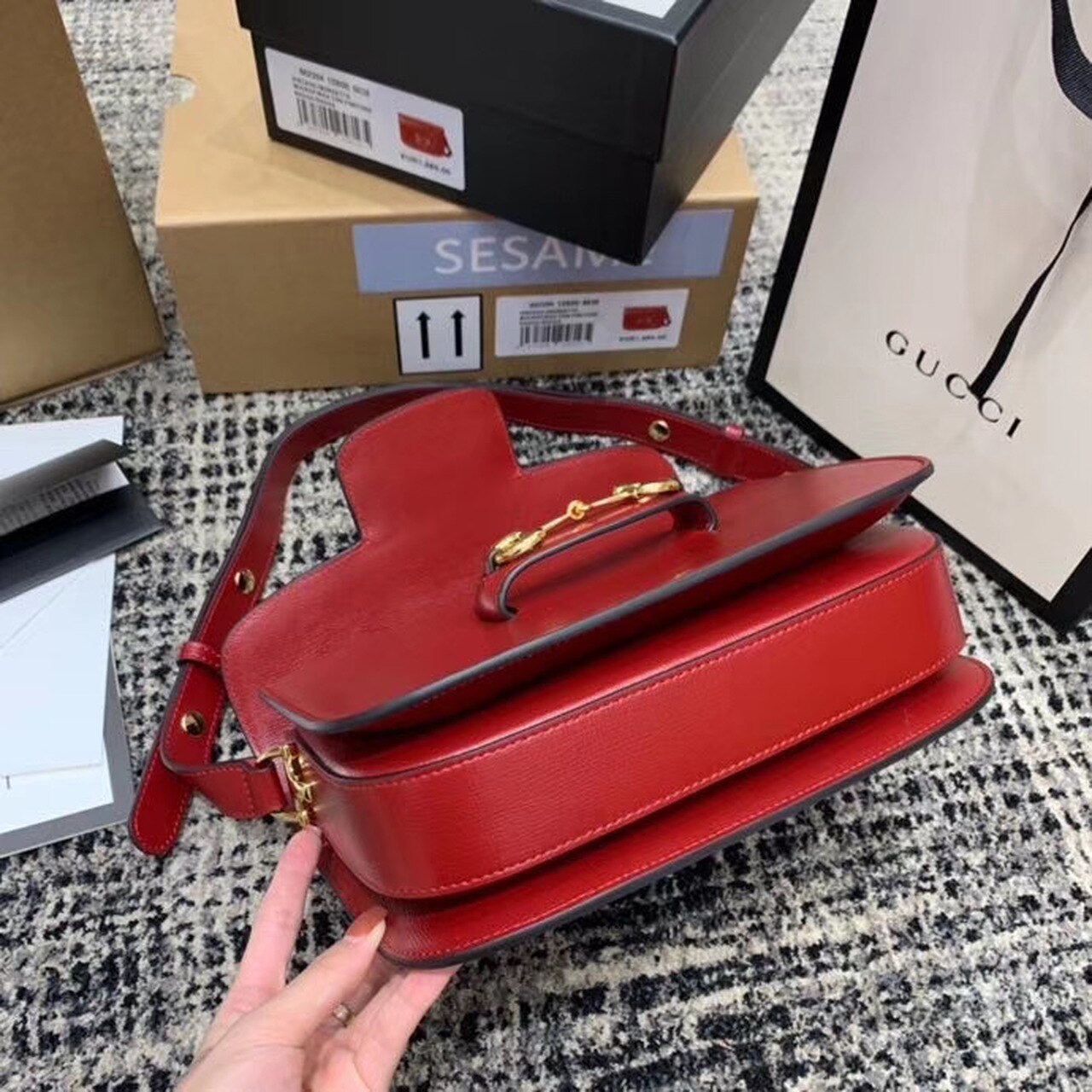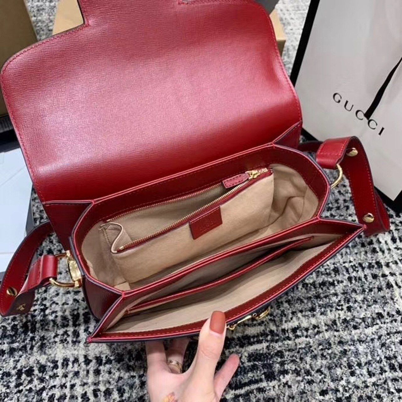 Introduced for Cruise 2020, the Gucci Horsebit 1955 bag is recreated from an archival design. With the same lines and forms first introduced over six decades ago, the accessory unifies the original details with a modern spirit, highlighting the Horsebit. Part of GG’s genetic code, the double ring and bar design has been established as one of the most distinctive elements among the House symbols borrowed from the equestrian world. Presented on a small flap shoulder bag, the hardware is paired with textured red and completed with a special mechanism that adjusts the length of the shoulder strap so it can be carried on one shoulder or cross body.