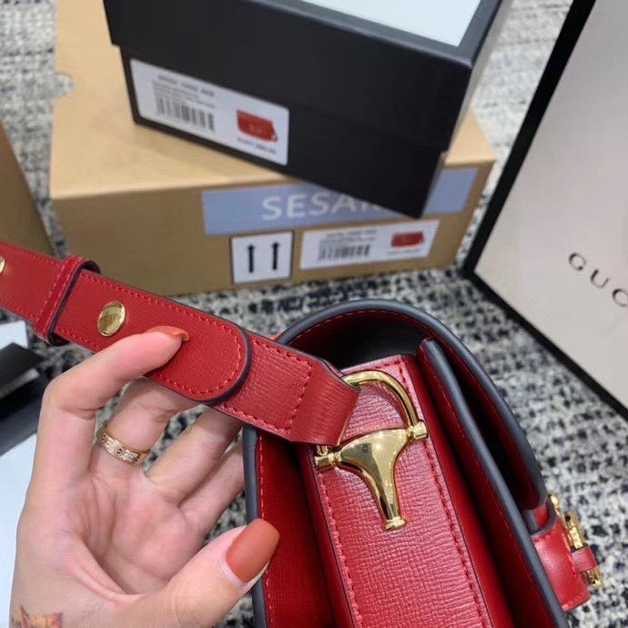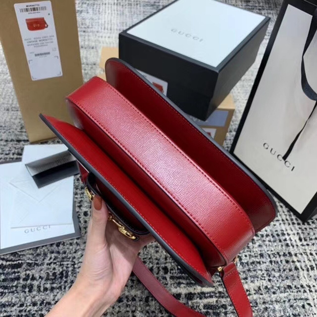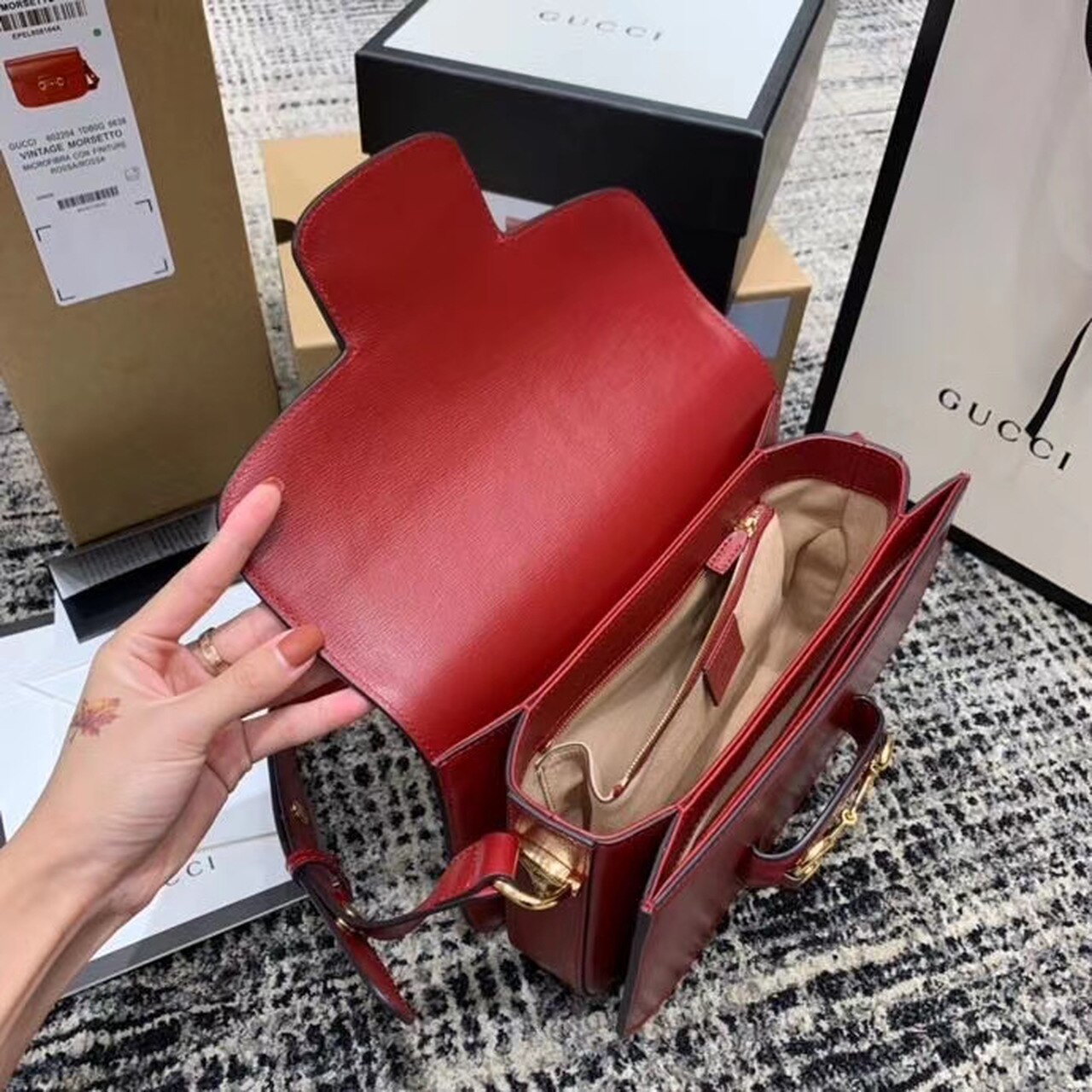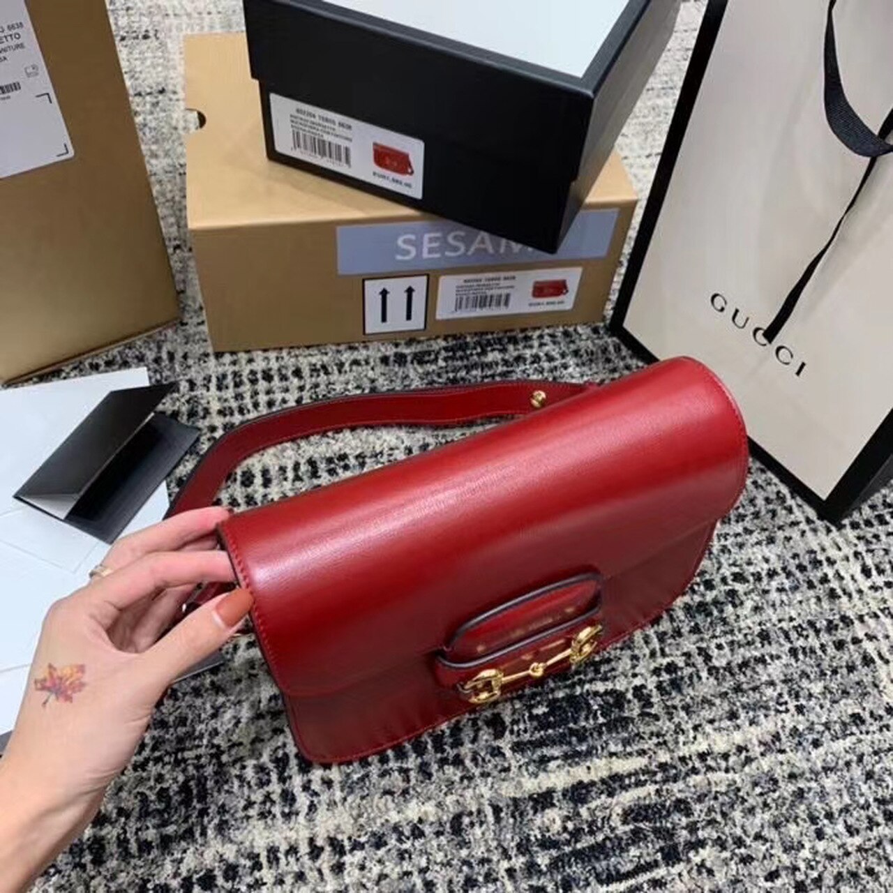Introduced for Cruise 2020, the Gucci Horsebit 1955 bag is recreated from an archival design. With the same lines and forms first introduced over six decades ago, the accessory unifies the original details with a modern spirit, highlighting the Horsebit. Part of GG’s genetic code, the double ring and bar design has been established as one of the most distinctive elements among the House symbols borrowed from the equestrian world. Presented on a small flap shoulder bag, the hardware is paired with textured red and completed with a special mechanism that adjusts the length of the shoulder strap so it can be carried on one shoulder or cross body.
