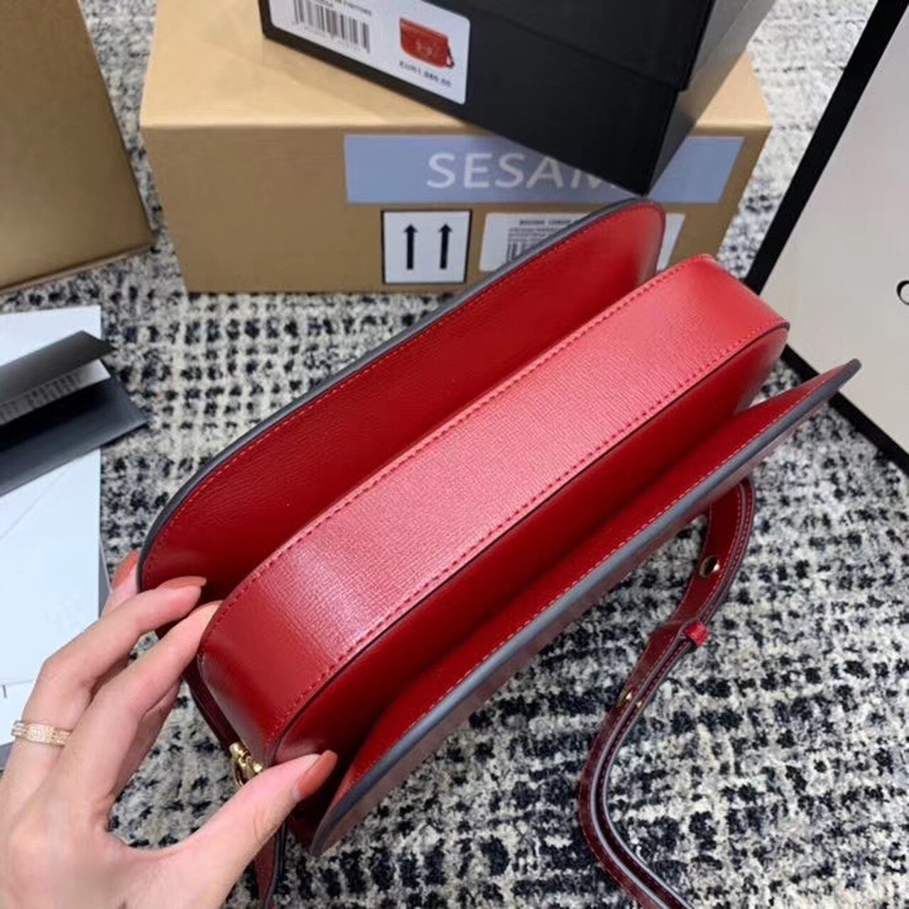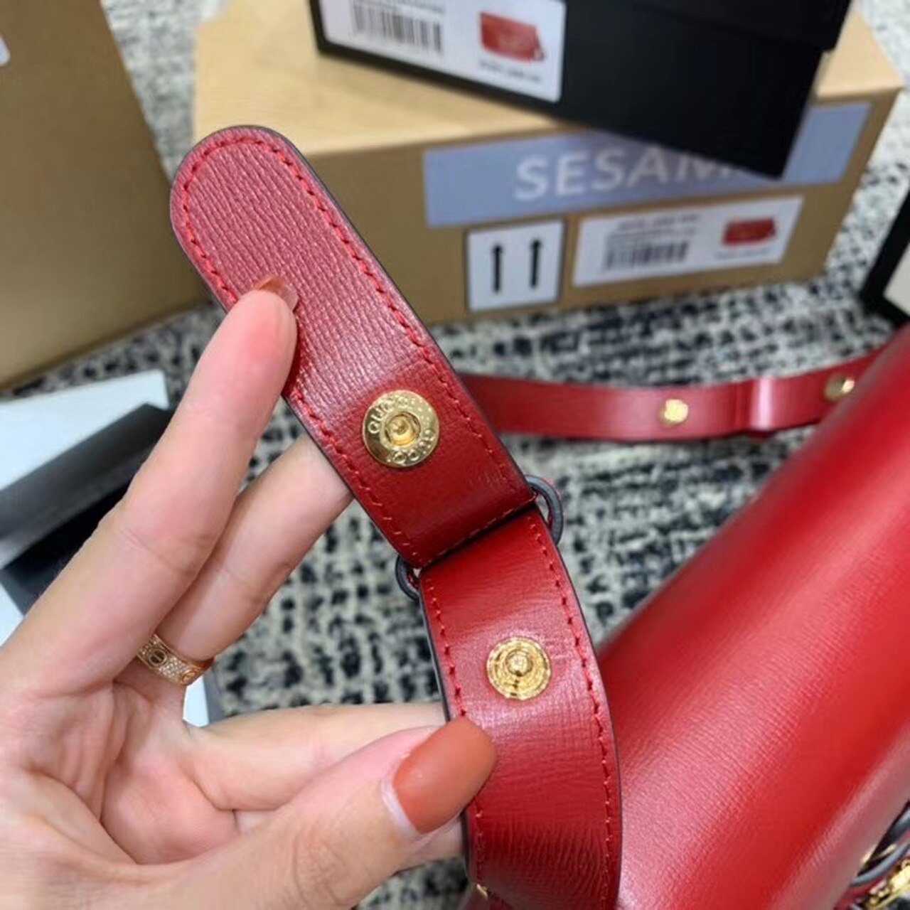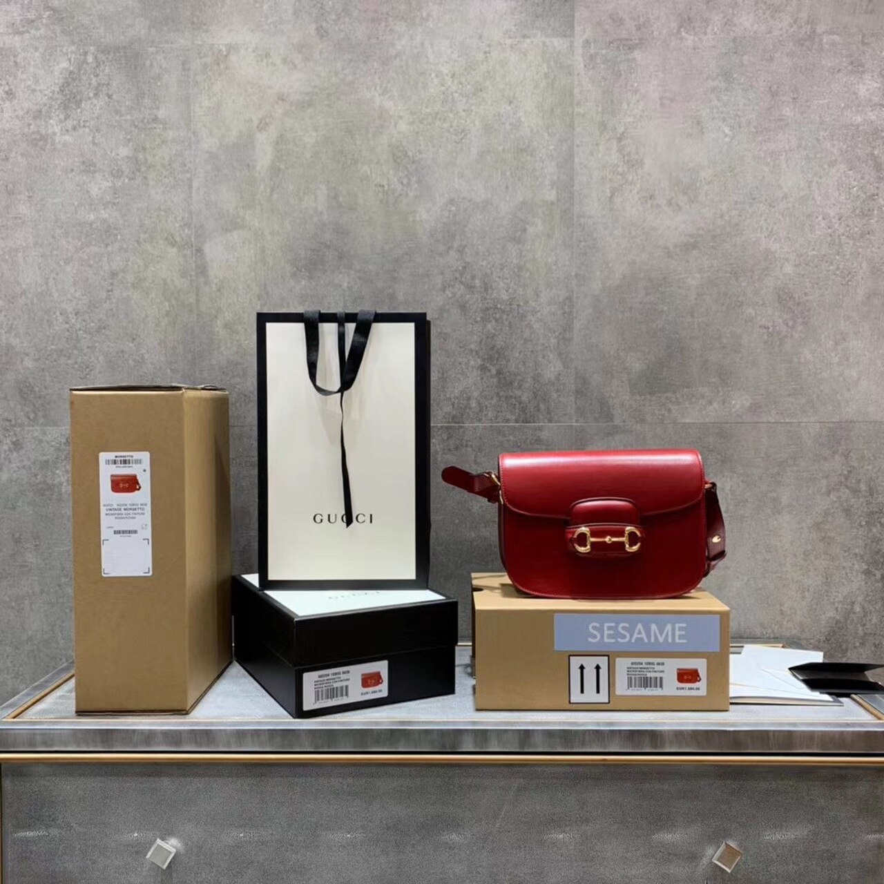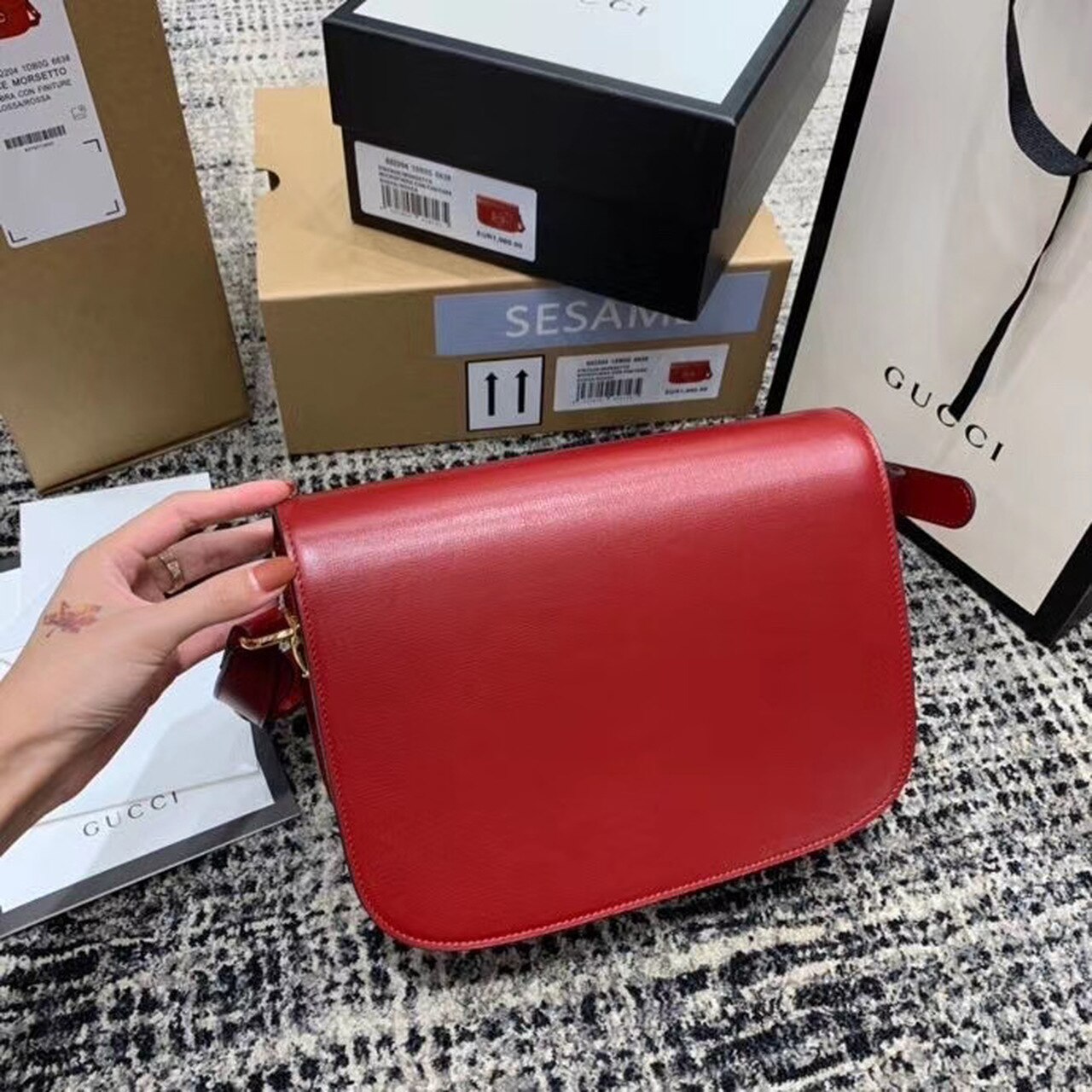 Introduced for Cruise 2020, the Gucci Horsebit 1955 bag is recreated from an archival design. With the same lines and forms first introduced over six decades ago, the accessory unifies the original details with a modern spirit, highlighting the Horsebit. Part of GG’s genetic code, the double ring and bar design has been established as one of the most distinctive elements among the House symbols borrowed from the equestrian world. Presented on a small flap shoulder bag, the hardware is paired with textured red and completed with a special mechanism that adjusts the length of the shoulder strap so it can be carried on one shoulder or cross body.