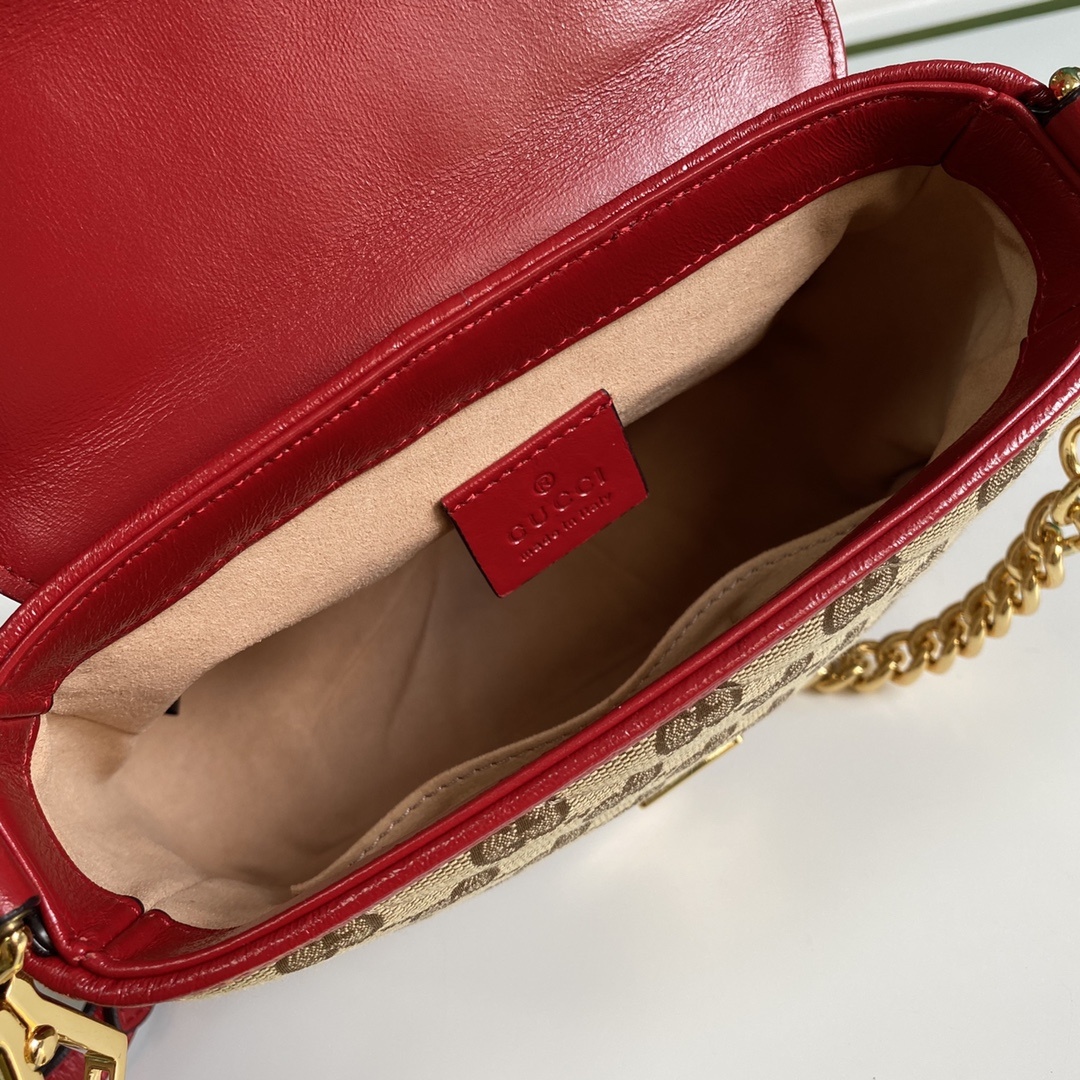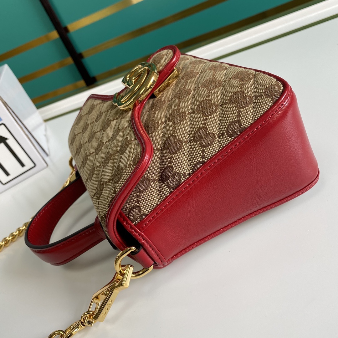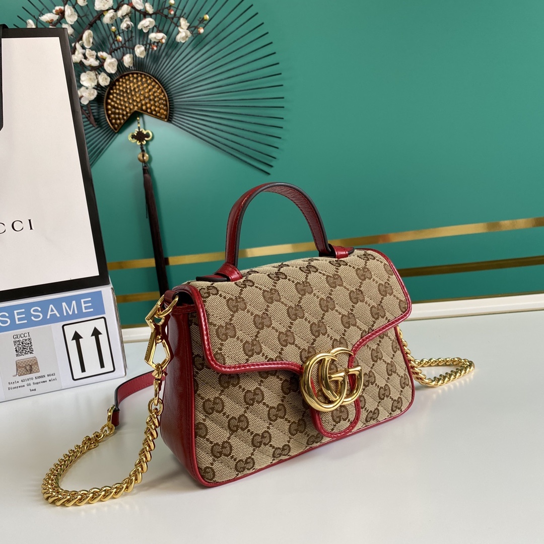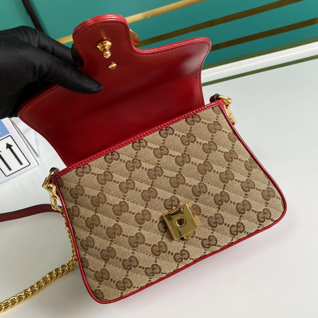Gucci Ladies Gucci Canvas Marmont Mini Top Handle Bag. Gucci mini top handle bag is crafted in beige and red Gucci canvas red trim and a shiny gold-toned hardware. This bag features a flap with spring closure Double G, a microfibre lining with a suede-like finish, 1 main interior compartment and 1 open pocket. Made in Italy.