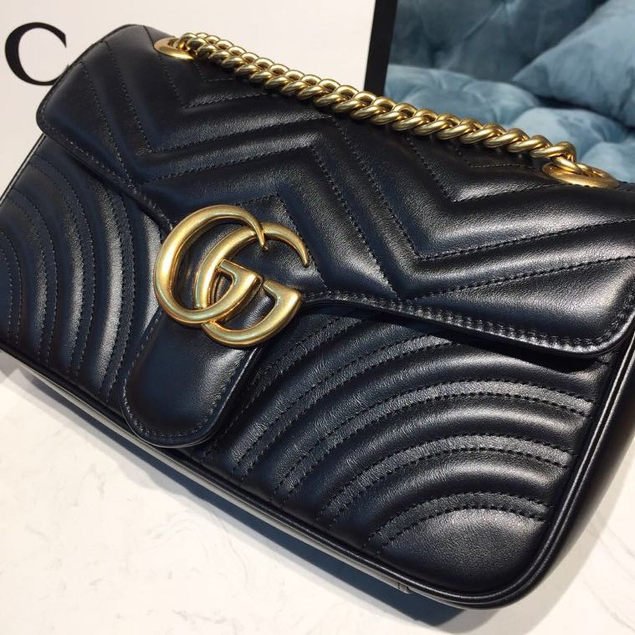 The small Gucci Marmont flap bag has a softly structured shape and an flap closure with Double G hardware. The sliding chain strap can be worn multiple ways, changing between a shoulder and a top handle bag. Made in matelassé chevron with a heart on the back.