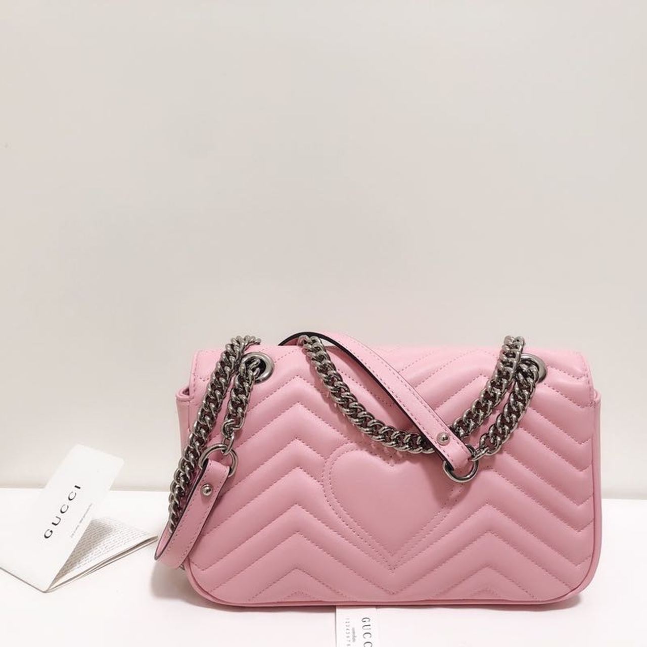 The small Gucci Marmont camera bag has a softly structured shape and a flap closure with Double G hardware. The sliding chain strap can be worn multiple ways, changing between a shoulder and a top handle bag. Made in matelassé chevron with a heart on the back.
