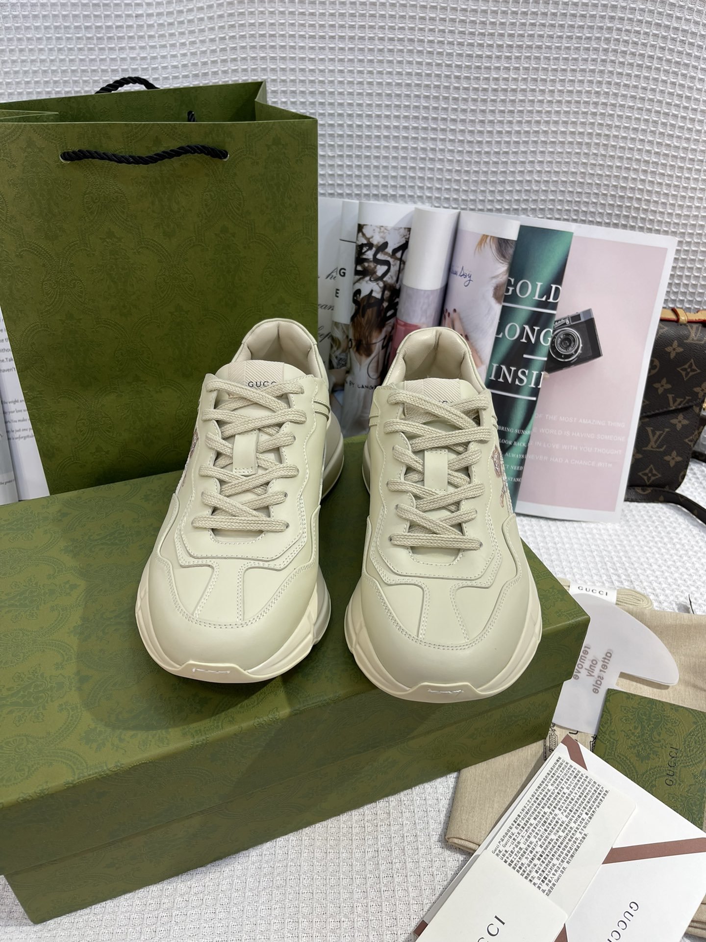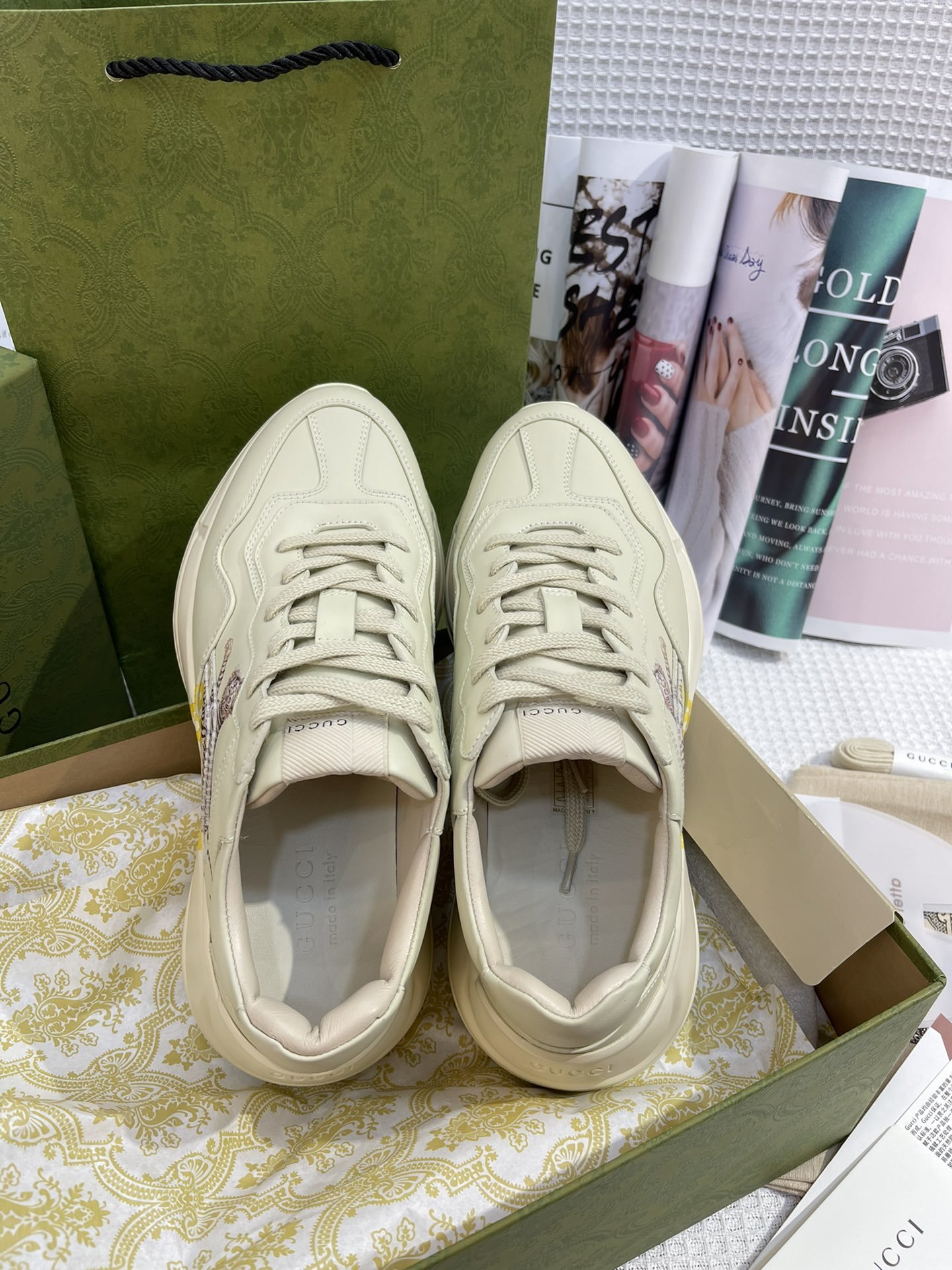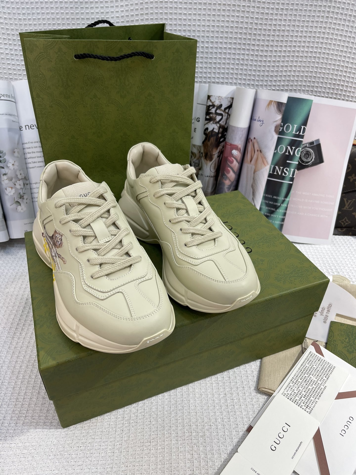This pair of Rhyton sneakers is characterised by the printed motto ‘Gucci Tiger.’ References to the feline are often seen throughout the Creative Director’s collections as an expression of the House’s fascination with the wild beauty of the natural world