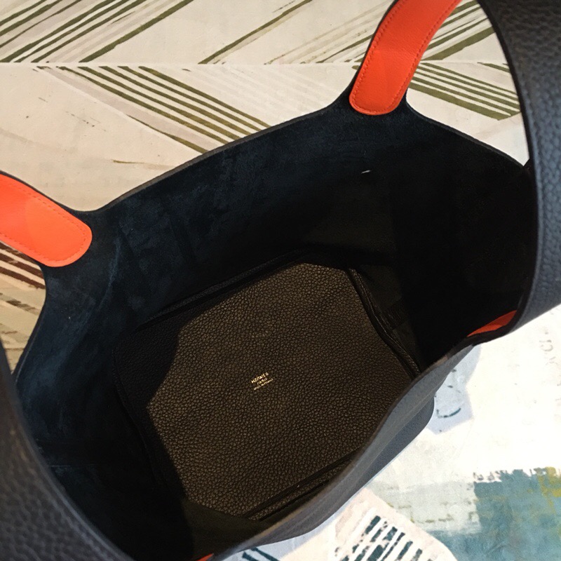 This Picotin Lock is in Black clemence with palladium hardware and has tonal stitching with two top handles. The interior is lined with natural, no interior pockets and has a pull through closure secured by padlock.
