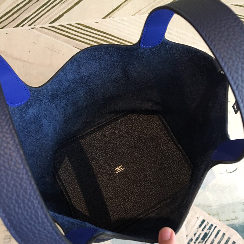 This Picotin Lock is in dark blue clemence with palladium hardware and has tonal stitching with two top handles. The interior is lined with natural, no interior pockets and has a pull through closure secured by padlock.