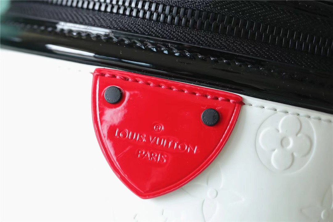 This fashionable Cannes handbag is made from white patent with a shiny red patch at the top, and Monogram canvas on the top handle and thin shoulder strap. This on-point piece can be carried in a variety of ways, thanks to its top handle and adjustable strap.