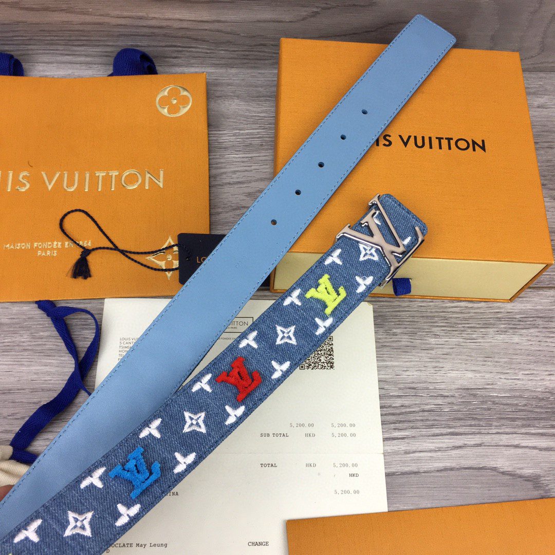 • Louis Vuitton Initiales Reversible Belt Monogram Denim Silver Toned Hardware LV Women Belt