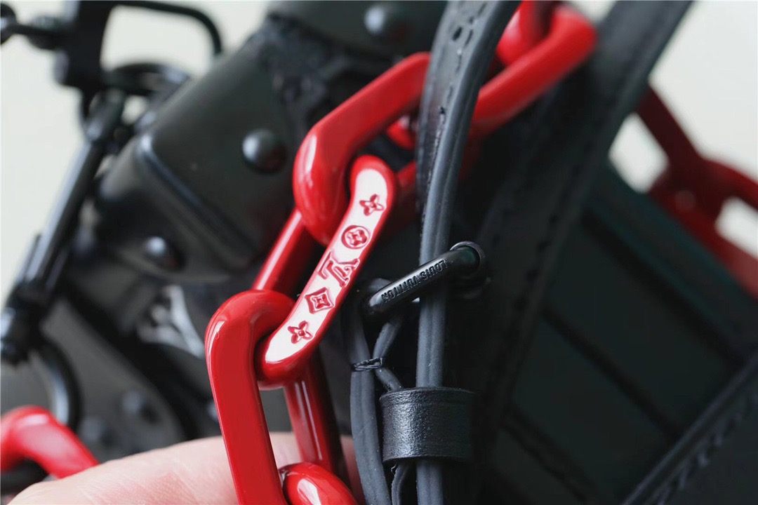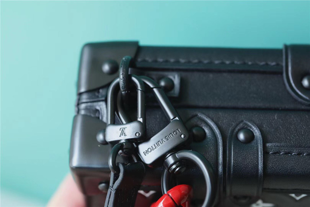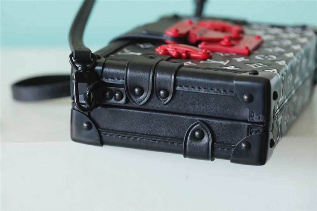 This Petite Malle handbag with its black-and-white Monogram motif and bright-red resin chain and S-lock is striking. It is made from embossed with a soft, cushiony feel. Flawlessly crafted, this “little trunk” moves stylishly from day to evening. It can be hand-carried as a clutch or attached to the strap for cross-body wear.