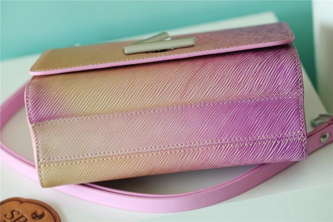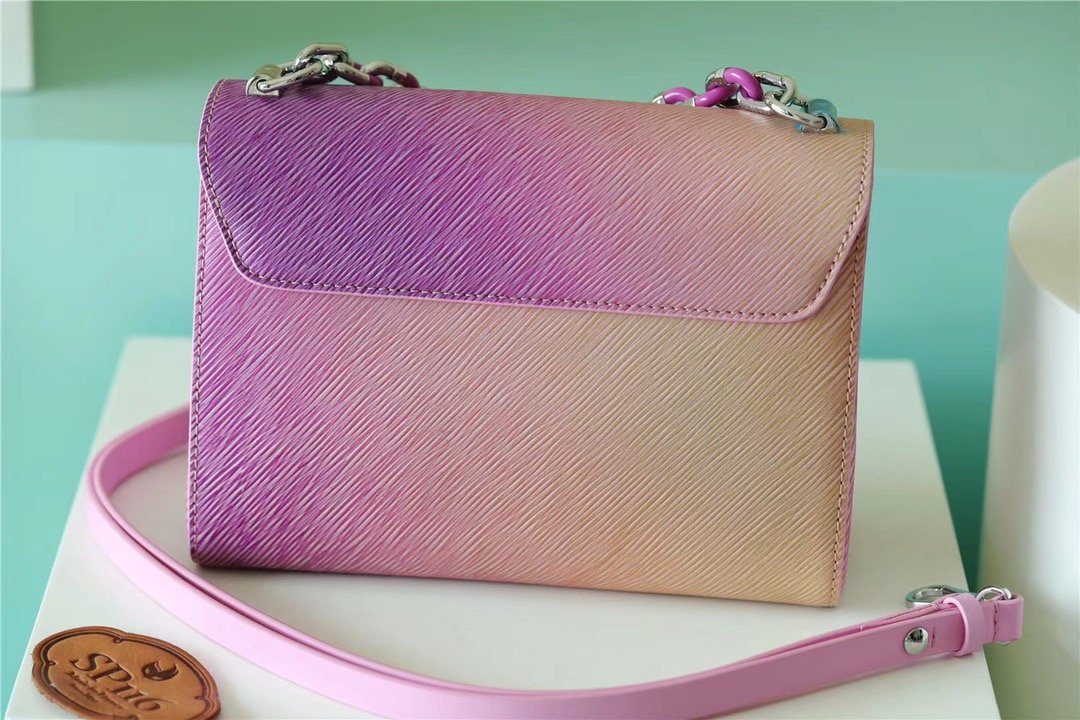 For Spring 22, a colorful reinterpretation of the Twist MM handbag. Inspired by the colors of sunrise, the fresh orange fades delicately into pink, a perfect summer colorway, on this Twist MM handbag. The grain of the Epi material enhances the gradient combination of the two colors. It has a chunky, bicolor chain and a removable and adjustable, shoulder strap, allowing multiple carrying options.