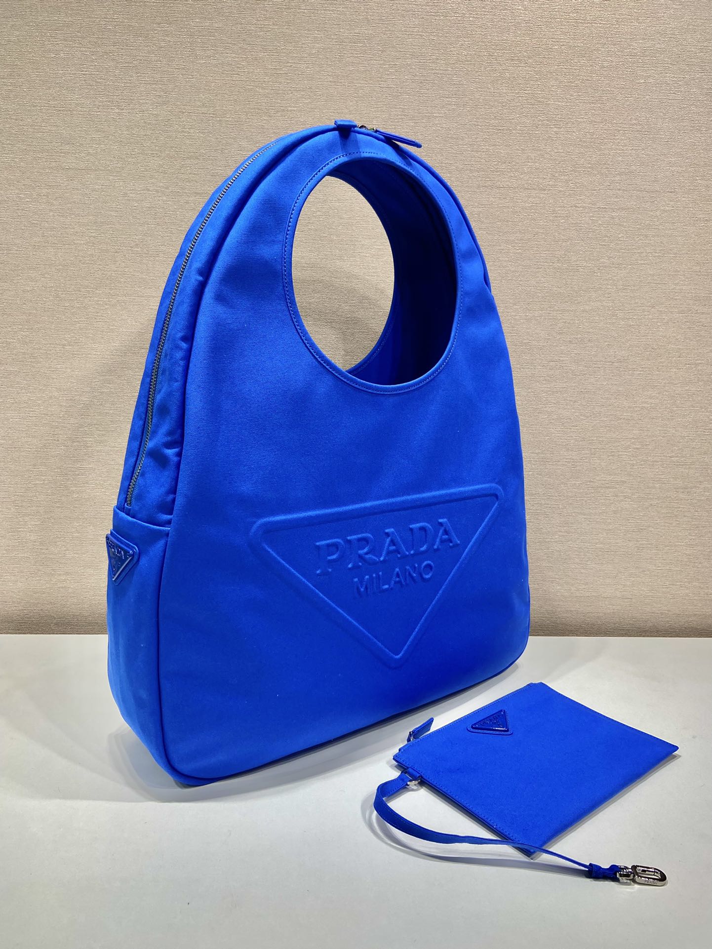 Reinterpreting classic beach designs in a contemporary way, this line of functional canvas bags with an enveloping silhouette features delicate tonal details for a monochrome, one-material effect. The new varnished Prada logo with a semi-gloss finish adds a luminous accent.