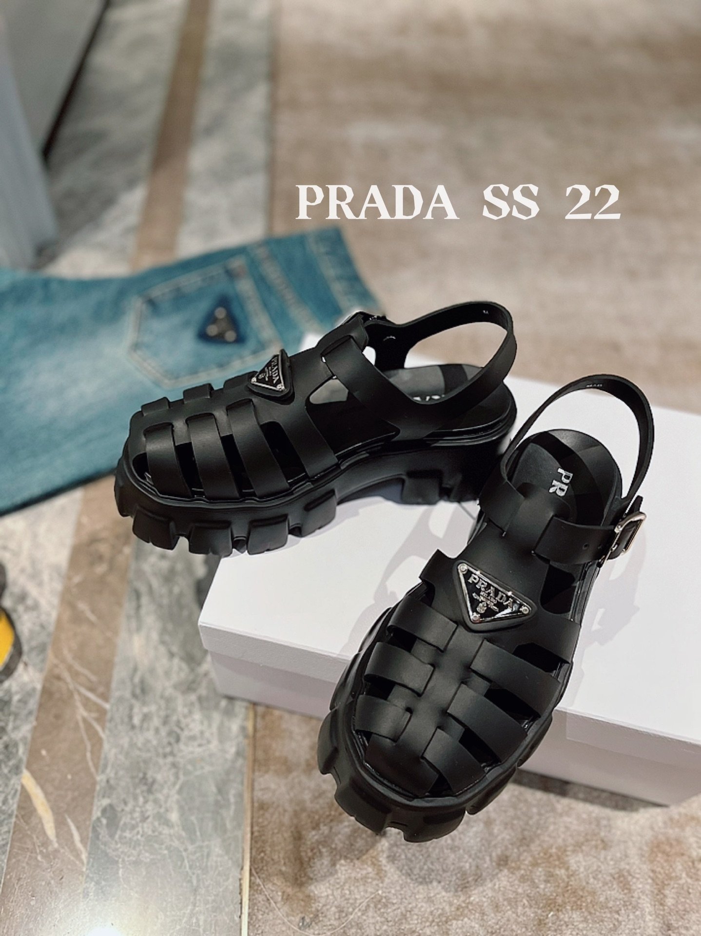 The chunky yet lightweight design of the iconic Monolith sole made of rubber is an expression of a timeless design, monolithic and unique, that reimagines Prada’s dual soul with a modernist twist. Made of rubber for a fun, contemporary look, the silhouette reinterprets retro beach footwear in a totally new way that reflect Prada’s hybrid soul.