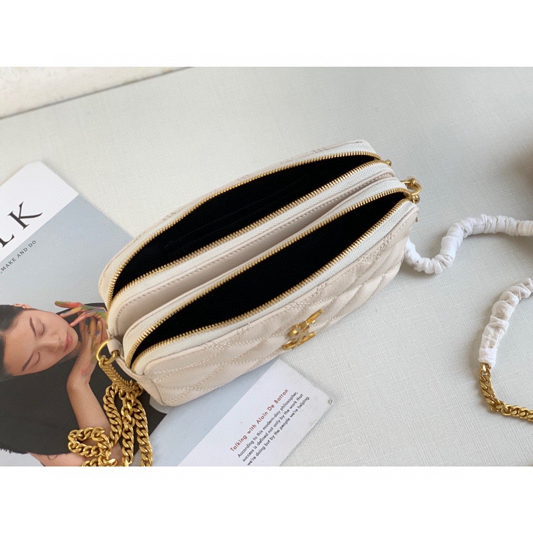 S.L’s signature golden YSL monogram plaque places the Becky camera bag firmly in glamorous territory. from diamond-quilted in white, this compartmentalized design swings from a metallic chain strap that will lend a touch of opulence to evening attire.