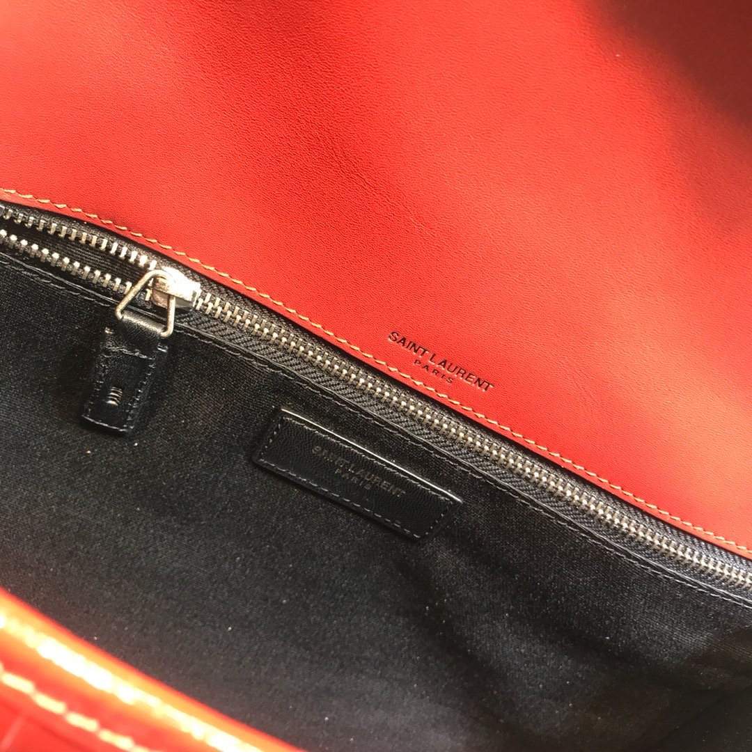 Yves Saint Laurent monogram bag made with metal-free tanned and organic cotton lining featuring a front flap with magnetic snap closure decorated with covered iconic ysl signature.