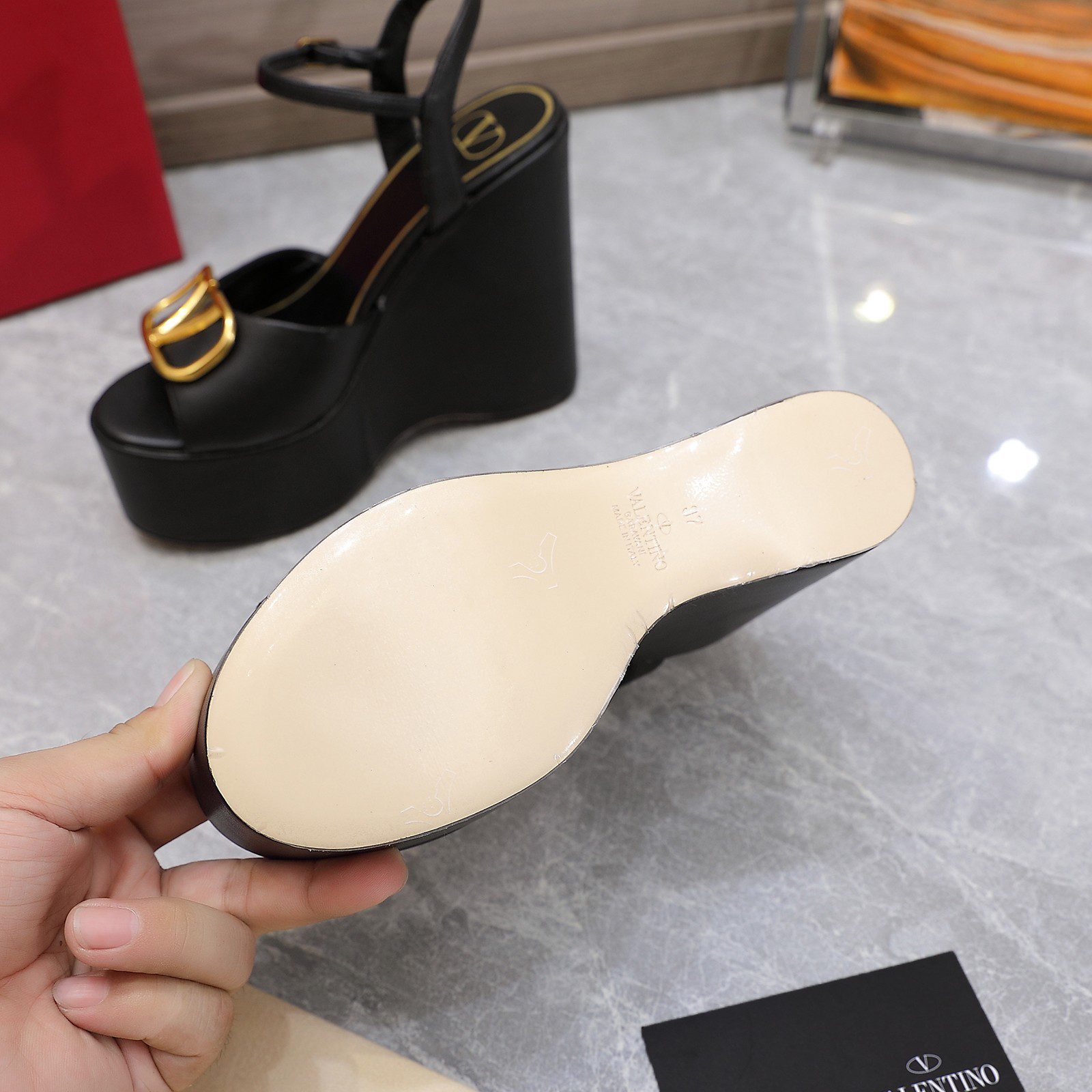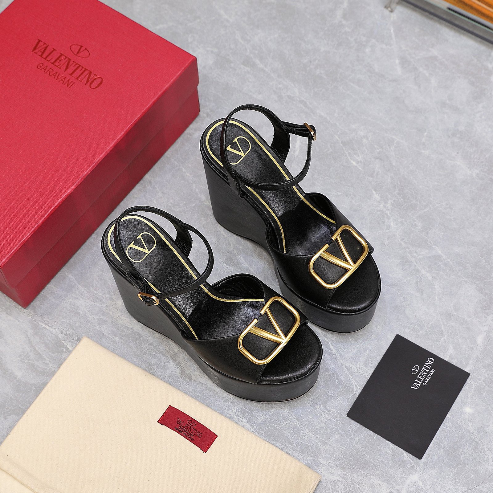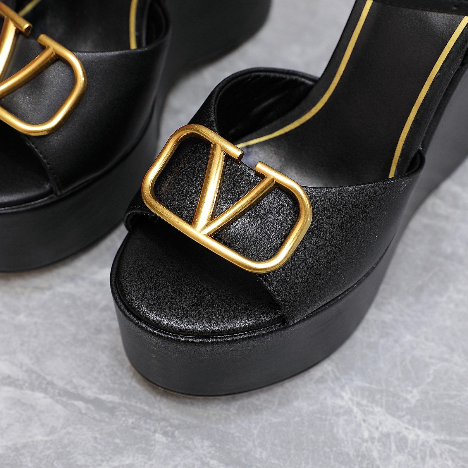 Black VLogo Signature sandals from the spring-summer collection are sure to be the center of attention. Both a high wedge and a large golden buckle in the form of an archival logo of the brand founded by Valentino Garavani work for this. For tailoring the product, the masters of the brand used soft thin, polished to a matte finish.