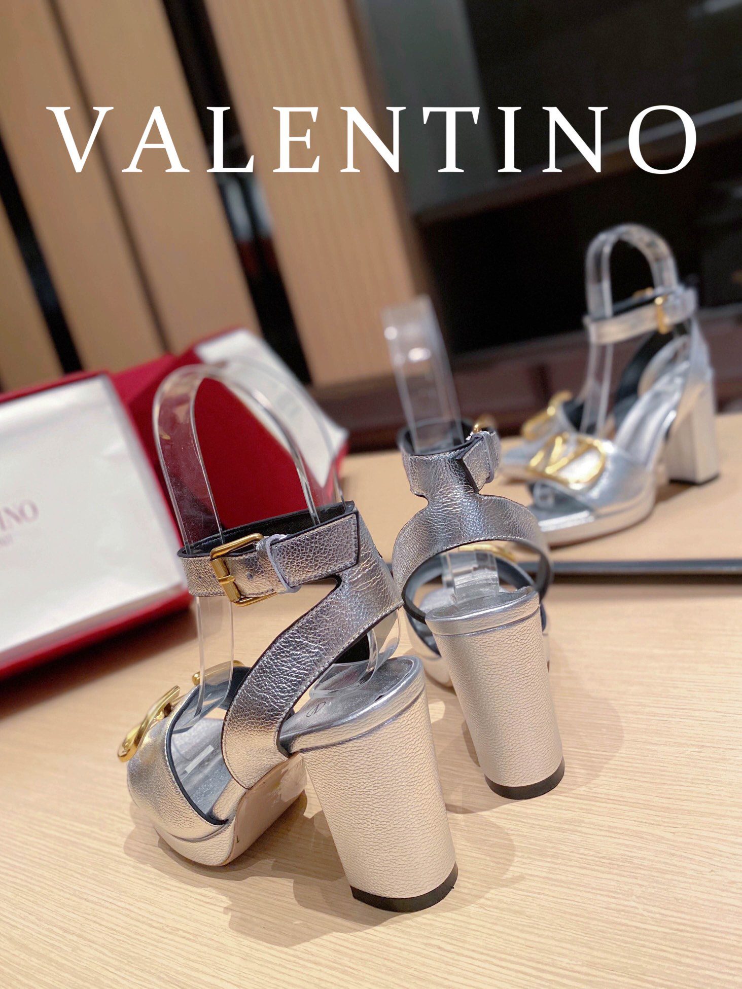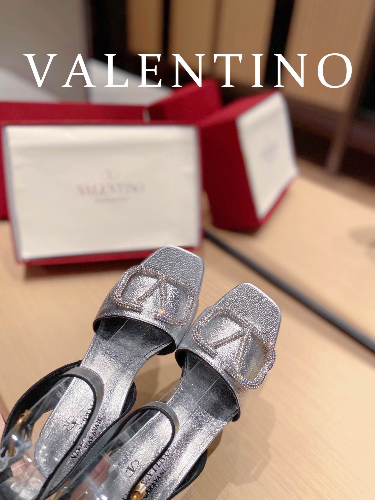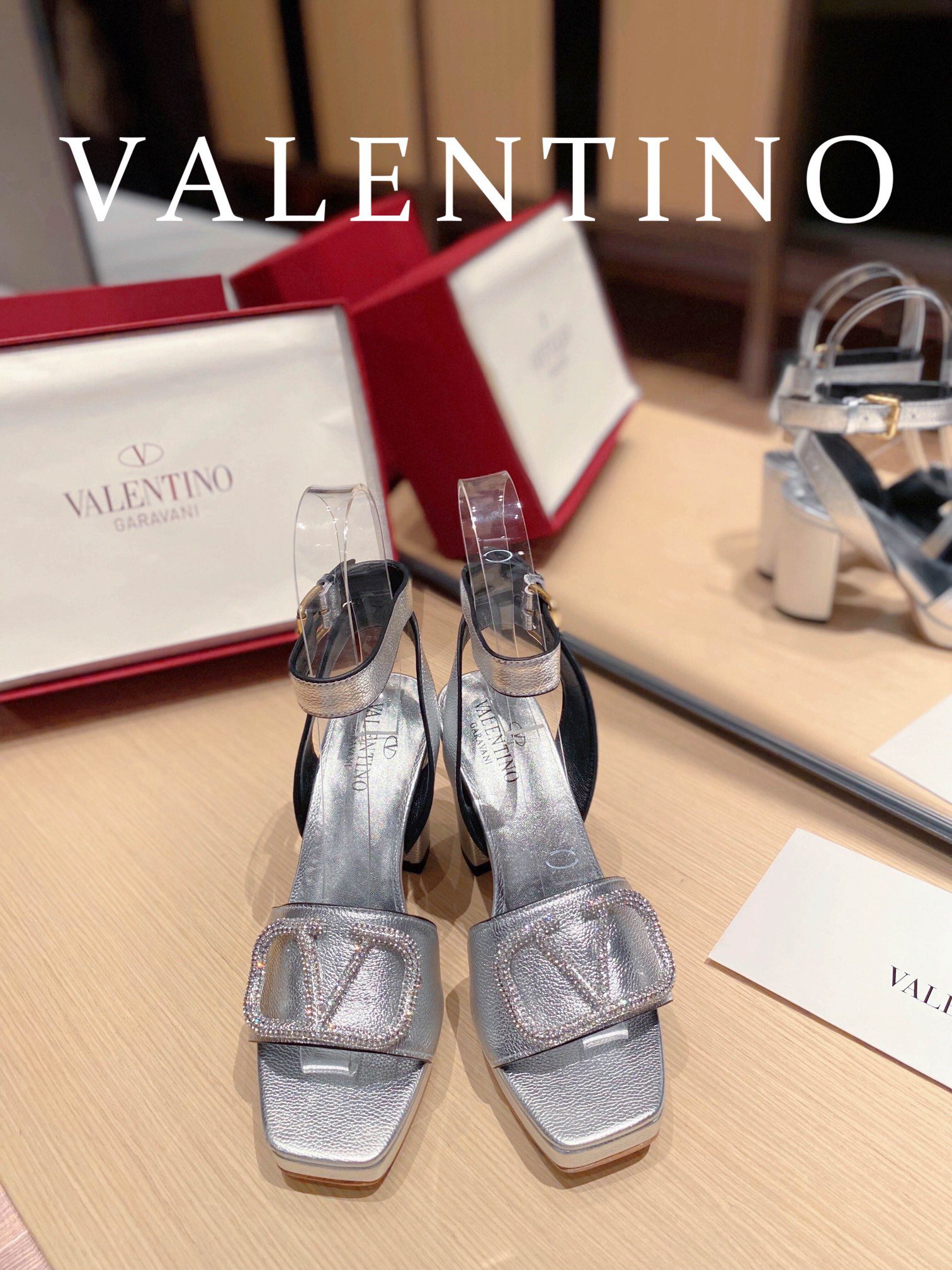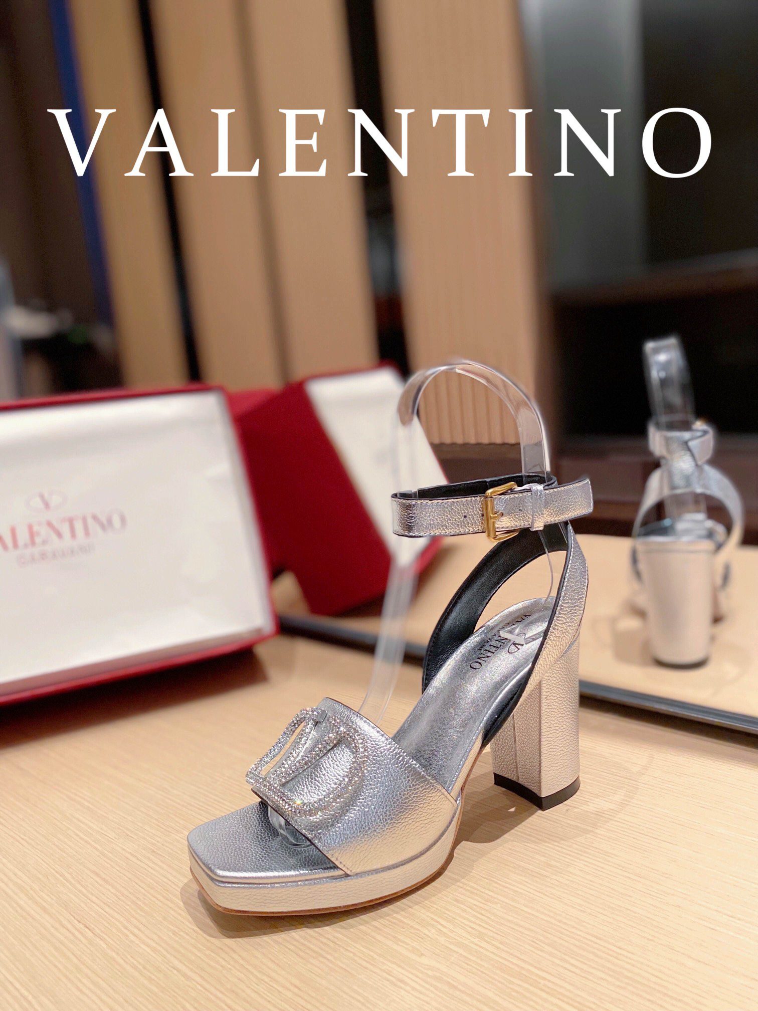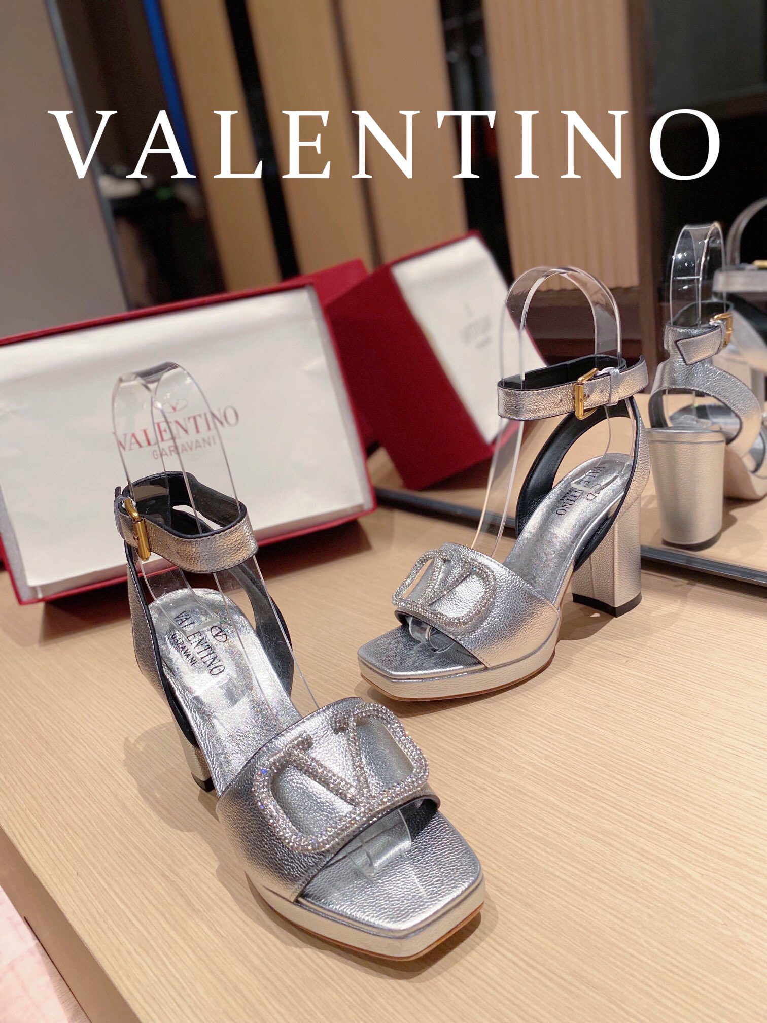 • Valentino Garavani Strap Heeled Sandals With V Logo Crystal Embellishment Silver For Women